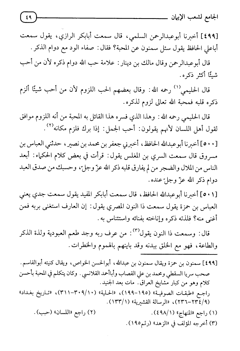 499 - أَخْبَرَنَا أَبُو عَبْدِ الرَّحْمَنِ السُّلَمِيُّ قَالَ: سَمِعْتُ أَبَا بَكْرٍ الرَّازِيَّ يَقُولُ: سَمِعْتُ أَبَا عَلِيٍّ الْحَافِظَ يَقُولُ: سُئِلَ سَمْنُونٌ عَنِ §الْمَحَبَّةِ فَقَالَ: " صَفَاءُ الْوِدِّ مَعَ دَوَامِ الذِّكْرِ "