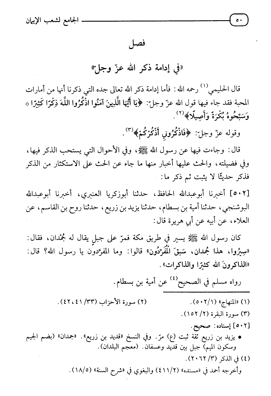 §فَصْلٌ فِي إِدَامَةِ ذِكْرِ اللهِ عَزَّ وَجَلَّ قَالَ الْحَلِيمِيُّ رَحِمَهُ اللهُ: " فَأَمَّا إِدَامَةِ ذِكْرِ اللهِ تَعَالَى جَدُّهُ الَّتِي ذَكَرْنَا أنهَا من أَمَارَاتِ الْمَحَبَّةِ، فَقَدْ جَاءَ فِيهَا قَوْلُ اللهِ عَزَّ وَجَلَّ: {يَا أَيُّهَا الَّذِينَ آمَنُوا اذْكُرُوا اللهَ ذِكْرًا كَثِيرًا، وَسَبِّحُوهُ بُكْرَةً وَأَصِيلًا} [الأحزاب: 42]، وَقَوْلُهُ عَزَّ وَجَلَّ: {فَاذْكُرُونِي أَذْكُرْكُمْ} [البقرة: 152]، قَالَ: وَجَاءَتْ فِيهَا عَنْ رَسُولِ اللهِ صَلَّى اللَّهُ عَلَيْهِ وَسَلَّمَ، وَفِي الْأَحْوَالِ الَّتِي يُسْتَحَبُّ الذِّكْرُ فِيهَا، وَفِي فَضِيلَتِهِ وَالْحَثِّ عَلَيْهَا أَخْبَارٌ مِنْهَا مَا جَاءَ عَنِ الْحَثِّ عَلَى الِاسْتِكْثَارِ مِنَ الذِّكْرِ " فَذَكَرَ حَدِيثًا لَا يَثْبُتُ ثُمَّ ذَكَرَ