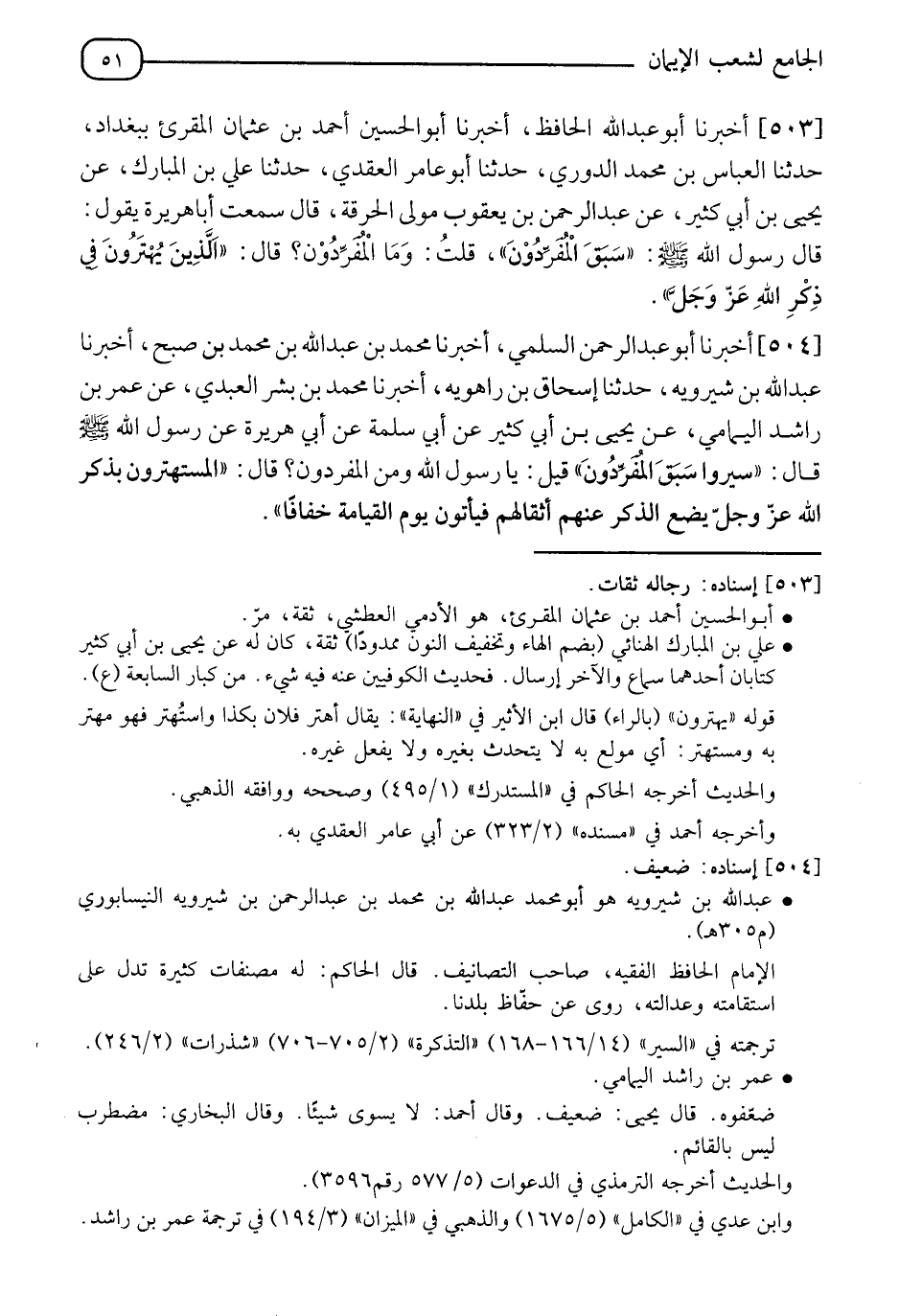 504 - أَخْبَرَنَا أَبُو عَبْدِ الرَّحْمَنِ السُّلَمِيُّ، أَخْبَرَنَا مُحَمَّدُ بْنُ عَبْدِ اللهِ بْنِ مُحَمَّدِ بْنِ صُبحٍ، أَخْبَرَنَا عَبْدُ اللهِ بْنُ شِيرَوَيْهِ، حدثنا إِسْحَاقُ بْنُ رَاهُوَيْهِ، أَخْبَرَنَا مُحَمَّدُ بْنُ بِشْرٍ الْعَبْدِيُّ، عَنْ عُمَرَ بْنِ رَاشِدٍ الْيَمَامِيِّ، عَنْ يَحْيَى بْنِ أَبِي كَثِيرِ، عَنْ أَبِي سَلَمَةَ، عَنْ أَبِي هُرَيْرَةَ عَنْ رَسُولِ اللهِ صَلَّى اللَّهُ عَلَيْهِ وَسَلَّمَ قَالَ: " §سِيرُوا سَبَقَ الْمُفَرِّدُونَ ". قِيلَ: يَا رَسُولَ اللهِ، وَمَنِ الْمُفَرِّدُونَ؟ قَالَ: " الْمُسْتَهْتَرُونَ بذِكْرِ اللهِ عَزَّ وَجَلَّ يَضَعُ الذِّكْرُ عَنْهُمْ أَثْقَالَهُمْ، فَيَأْتُونَ يَوْمَ الْقِيَامَةِ خِفَافًا " -[52]- أَخْبَرَنَا أَبُو الْحُسَيْنِ بْنُ بِشْرَانَ بِبَغْدَادَ، حدثنا الْحُسَيْنُ بْنُ صَفْوَانَ، حدثنا ابْنُ أَبِي الدُّنْيَا، حدثنا مُحَمَّدُ بْنُ يَزِيدَ الْعِجْلِيُّ، حدثنا مُحَمَّدُ بْنُ بِشْرٍ، فَذَكَرَهُ بِإِسْنَادِهِ بِنَحْوِهِ غَيْرَ أَنَّهُ قَالَ: " الَّذِينَ أُهْتِرُوا بِذِكْرِ اللهِ يَضَعُ الذِّكْرُ عَنْهُمْ أَوْزَارَهُمْ " " وَلَمْ يَذْكُرْ مَا بَعْدَهُ، وَالْإِسْنَادُ الْأَوَّلُ أَصَحُّ، وَاللهُ أَعْلَمُ "