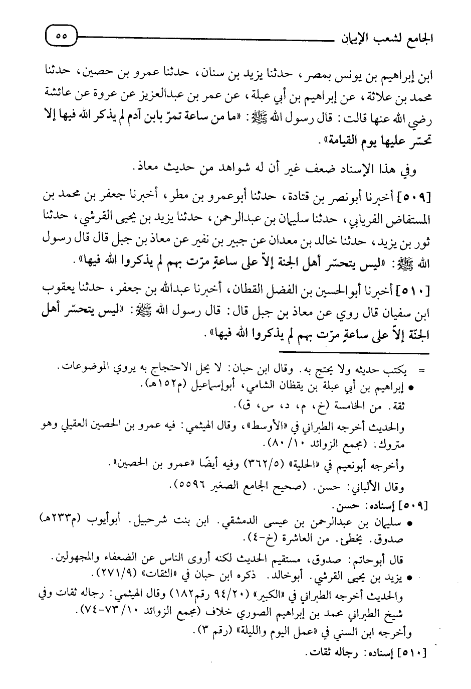 510 - أَخْبَرَنَا أَبُو الْحُسَيْنِ بْنُ الْفَضْلِ الْقَطَّانُ، أَخْبَرَنَا عَبْدُ اللهِ بْنُ جَعْفَرٍ، حدثنا يَعْقُوبُ بْنُ سُفْيَانَ قَالَ: رُوِيَ عَنْ مُعَاذِ بْنِ جَبَلٍ قَالَ: قَالَ رَسُولُ اللهِ صَلَّى اللَّهُ عَلَيْهِ وَسَلَّمَ: §" لَيْسَ يَتَحَسَّرُ أَهْلُ الْجَنَّةِ إِلَّا عَلَى سَاعَةٍ مَرَّتْ بِهِمْ لَمْ يَذْكُرُوا اللهَ فِيهَا " -[56]- قَالَ يَعْقُوبُ: حَدَّثَنِي بِذَلِكَ مَحْمُودُ بْنُ خَالِدٍ، عَنْ سُلَيْمَانَ بْنِ عَبْدِ الرَّحْمَنِ، حدثنا يَزِيدُ بْنُ يَحْيَى أَبُو خَالِدٍ، عَنْ ثَوْرِ بْنِ يَزِيدَ، عَنْ خَالِدِ بْنِ مَعْدَانَ، عَنْ جُبَيْرِ بْنِ نُفَيْرٍ يَعْنِي عَنْ مُعَاذٍ