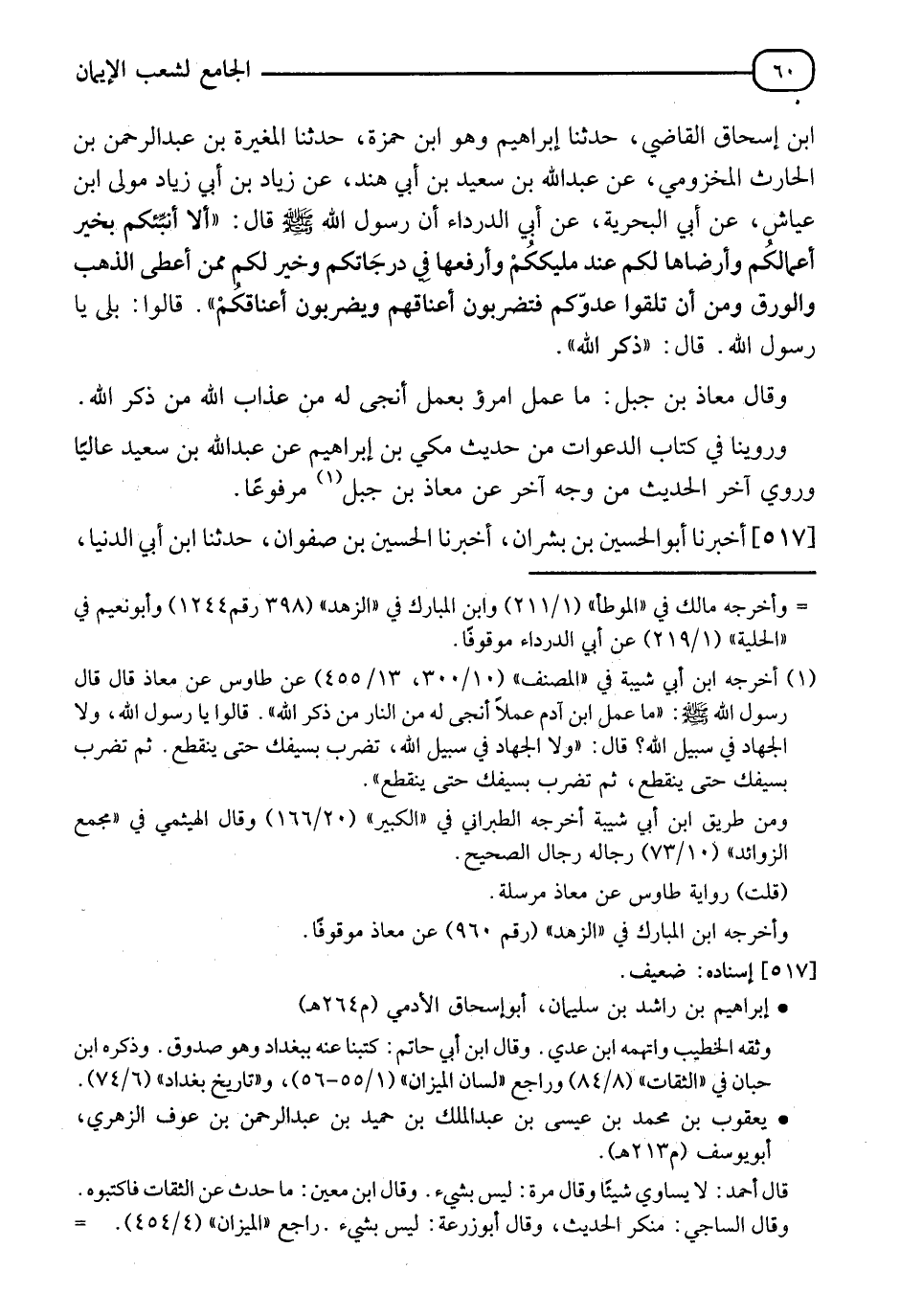 517 - أَخْبَرَنَا أَبُو الْحُسَيْنِ بْنُ بِشْرَانَ، أَخْبَرَنَا الْحُسَيْنُ بْنُ صَفْوَانَ، حدثنا ابْنُ أَبِي الدُّنْيَا، -[61]- حَدَّثَنِي إِبْرَاهِيمُ بْنُ رَاشِدٍ، حدثنا يَعْقُوبُ بْنُ مُحَمَّدٍ الزُّهْرِيُّ، حدثنا مُحَمَّدُ بْنُ عَامِرِ بْنِ خَارِجَةَ بْنِ عَبْدِ اللهِ بْنِ سَعْدِ بْنِ أَبِي وَقَّاصٍ، عَنْ مُحَمَّدِ بْنِ عَبْدِ الْمَلِكِ بْنِ زُرَارَةَ الْأَنْصَارِيِّ، عَنْ أَبِي عَبْدِ الرَّحْمَنِ الشَّامِيِّ، عَنْ عَبْدِ الرَّحْمَنِ بْنِ غَنْمٍ، عَنْ مُعَاذِ بْنِ جَبَلٍ قَالَ: قَالَ رَسُولُ اللهِ صَلَّى اللَّهُ عَلَيْهِ وَسَلَّمَ: §" أَكْثِرُوا ذِكْرَ اللهِ عَلَى كُلِّ حَالٍ فَإِنَّهُ لَيْسَ عَمَلٌ أَحَبَّ إِلَى اللهِ وَلَا أَنْجَى لِعَبْدِهِ مِنْ ذِكْرِ اللهِ فِي الدُّنْيَا وَالْآخِرَةِ " قَالَ الْبَيْهَقِيُّ رَحِمَهُ اللهُ: " وَفِي مَعْنَاهُ مِنْ وَجْهٍ آخَرَ ضَعِيفٍ مَرْفُوعًا "