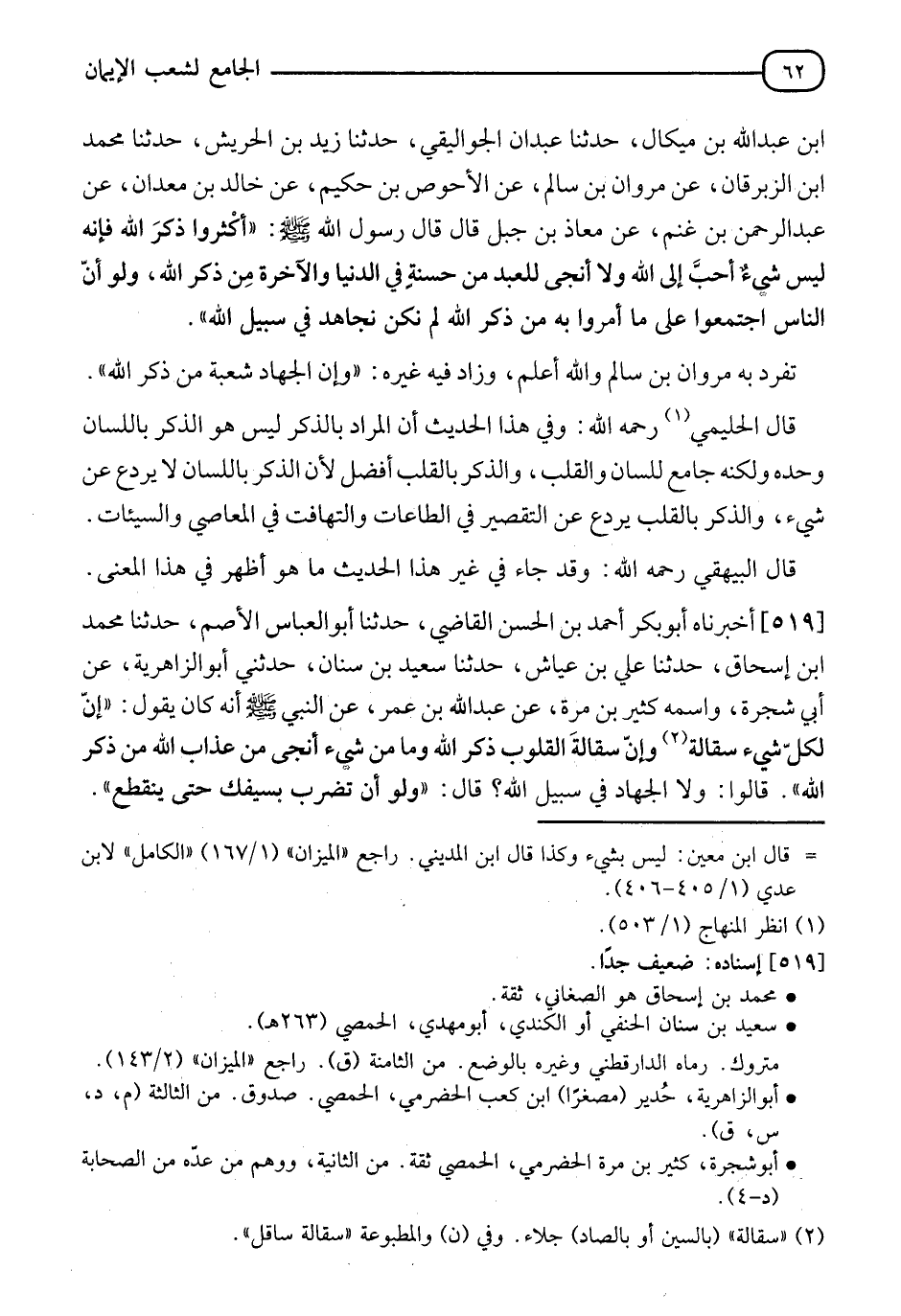 519 - أَخْبَرَنَاهُ أَبُو بَكْرٍ أَحْمَدُ بْنُ الْحَسَنِ الْقَاضِي، حدثنا أَبُو الْعَبَّاسِ الْأَصَمُّ، حدثنا مُحَمَّدُ بْنُ إِسْحَاقَ، حدثنا عَلِيُّ بْنُ عَيَّاشٍ، حدثنا سَعِيدُ بْنُ سِنَانٍ، حَدَّثَنِي أَبُو الزَّاهِرِيَّةِ، عَنْ أَبِي شَجَرَةَ وَاسْمُهُ كَثِيرُ بْنُ مُرَّةَ، عَنْ عَبْدِ اللهِ بْنِ عُمَرَ، عَنِ النَّبِيِّ صَلَّى اللَّهُ عَلَيْهِ وَسَلَّمَ، أَنَّهُ كَانَ يَقُولُ: " §إِنَّ لِكُلِّ شَيْءٍ سِقَالَةً، وَإِنَّ سِقَالَةَ الْقُلُوبِ ذِكْرُ اللهِ، وَمَا مِنْ شَيْءٍ أَنْجَى مِنْ عَذَابِ اللهِ مِنْ ذِكْرِ اللهِ ". قَالُوا: وَلَا الْجِهَادُ فِي سَبِيلِ اللهِ؟ قَالَ: " وَلَوْ أَنْ تَضْرِبَ بِسَيْفِكَ حَتَّى يَنْقَطِعَ "