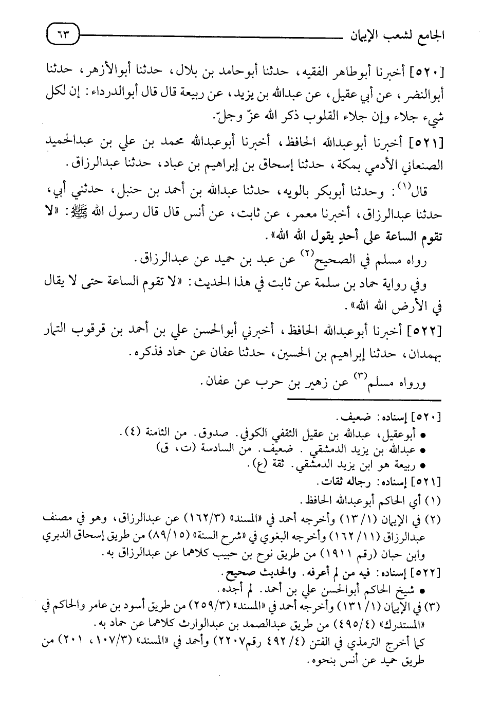 521 - أَخْبَرَنَا أَبُو عَبْدِ اللهِ الْحَافِظُ، أَخْبَرَنَا أَبُو عَبْدِ اللهِ مُحَمَّدُ بْنُ عَلِيِّ بْنِ عَبْدِ الْحَمِيدِ الصَّنْعَانِيُّ الْآدَمِيُّ بِمَكَّةَ، حدثنا إِسْحَاقُ بْنُ إِبْرَاهِيمَ بْنِ عَبَّادٍ، حدثنا عَبْدِ الرَّزَّاقِ قَالَ: وَحَدَّثَنَا أَبُو بَكْرِ بْنُ بَالَوَيْهِ، حدثنا عَبْدُ اللهِ بْنُ أَحْمَدَ بْنِ حَنْبَلٍ، حَدَّثَنِي أَبِي، حَدَّثَنَا عَبْدُ الرَّزَّاقِ، أَخْبَرَنَا مَعْمَرٌ، عَنْ ثَابِتٍ، عَنْ أَنَسٍ قَالَ: قَالَ رَسُولُ اللهِ صَلَّى اللَّهُ عَلَيْهِ وَسَلَّمَ: " §لَا تَقُومُ السَّاعَةُ عَلَى أَحَدٍ يَقُولُ: اللهُ اللهُ " رَوَاهُ مُسْلِمٌ فِي الصَّحِيحِ، عَنْ عَبْدِ بْنِ حُمَيْدٍ، عَنْ عَبْدِ الرَّزَّاقِ وَفِي رِوَايَةِ حَمَّادِ بْنِ سَلَمَةَ، عَنْ ثَابِتٍ فِي هَذَا الْحَدِيثِ: " لَا تَقُومُ السَّاعَةُ حَتَّى لَا يُقَالَ فِي الْأَرْضِ اللهُ اللهُ ".