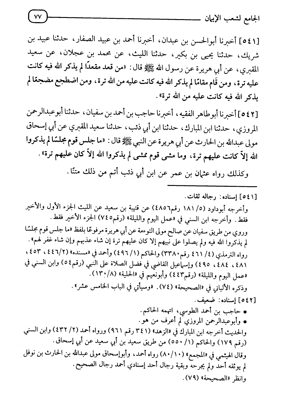 542 - أَخْبَرَنَا أَبُو طَاهِرٍ الْفَقِيهُ، أَخْبَرَنَا حَاجِبُ بْنُ أَحْمَدَ بْنِ سُفْيَانَ، حدثنا أَبُو عَبْدِ الرَّحْمَنِ الْمَرْوَزِيُّ، حدثنا ابْنُ الْمُبَارَكِ، حدثنا ابْنُ أَبِي ذِئْبٍ، حدثنا سَعِيدٌ الْمَقْبُرِيُّ، عَنْ أَبِي إِسْحَاقَ مَوْلَى عَبْدِ اللهِ بْنِ الْحَارِثِ، عَنْ أَبِي هُرَيْرَةَ، عَنِ النَّبِيِّ صَلَّى اللَّهُ عَلَيْهِ وَسَلَّمَ قال: §" مَا جَلَسَ قَوْمٌ مَجْلِسًا لَمْ يَذْكُرُوا اللهَ إِلَّا كَانَتْ عَلَيْهِمْ تِرَةً، وَمَا مَشَى قَوْمٌ مَمْشًى لَمْ يَذْكُرُوا اللهَ إِلَّا كَانَ عَلَيْهِمْ تِرَةً " وَكَذَلِكَ رَوَاهُ عُثْمَانُ بْنُ عُمَرَ، عَنِ ابْنِ أَبِي ذِئْبٍ أَتَمَّ مِنْ ذَلِكَ مَتْنًا