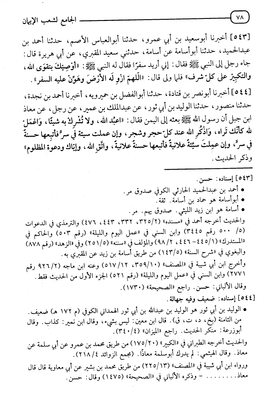 543 - أَخْبَرَنَا أَبُو سَعِيدِ بْنُ أَبِي عَمْرٍو، حدثنا أَبُو الْعَبَّاسِ الْأَصَمُّ، حدثنا أَحْمَدُ بْنُ عَبْدِ الْحَمِيدِ، حدثنا أَبُو أُسَامَةَ، عَنْ أُسَامَةَ، حَدَّثَنِي سَعِيدٌ الْمَقْبُرِيُّ، عَنْ أَبِي هُرَيْرَةَ قَالَ: جَاءَ رَجُلٌ إِلَى النَّبِيِّ صَلَّى اللَّهُ عَلَيْهِ وَسَلَّمَ فَقَالَ: إِنِّي أُرِيدُ سَفَرًا فَقَالَ لَهُ النَّبِيُّ صَلَّى اللَّهُ عَلَيْهِ وَسَلَّمَ: " §أُوصِيكَ بِتَقْوَى اللهِ، والتَّكْبِيرِ عَلَى كُلِّ شَرَفٍ " فَلَمَّا وَلَّى قَالَ: اللهُمَّ ازْوِ لَهُ الْأَرْضَ وَهَوِّنْ عَلَيْهِ السَّفَرَ "