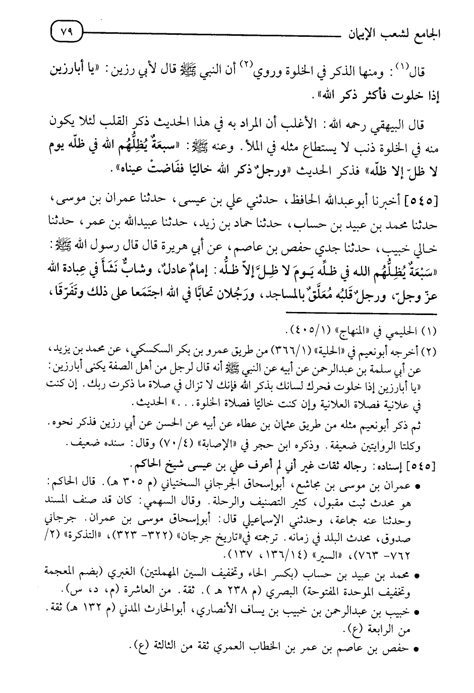 545 - أَخْبَرَنَا أَبُو عَبْدِ اللهِ الْحَافِظُ، حَدَّثَنِي عَلِيُّ بْنُ عِيسَى، حَدَّثَنَا عِمْرَانُ بْنُ مُوسَى، حَدَّثَنَا مُحَمَّدُ بْنُ عُبَيْدِ بْنِ حِسَابِ، حَدَّثَنَا حَمَّادُ بْنُ زَيْدٍ، حَدَّثَنَا عُبَيْدُ اللهِ بْنُ عُمَرَ، حَدَّثَنَا خَالِي خُبَيْبٌ حَدَّثَنَا جَدِّي حَفْصُ بْنُ عَاصِمٍ، عَنْ أَبِي هُرَيْرَةَ، قَالَ: قَالَ رَسُولُ اللهِ صَلَّى اللَّهُ عَلَيْهِ وَسَلَّمَ: " §سَبْعَةٌ يُظِلُّهُمُ اللهُ فِي ظِلِّهِ، يَوْمَ لَا ظِلَّ إِلَّا ظِلُّهُ، إِمَامٌ عَادِلٌ وَشَابٌّ نَشَأَ فِي عِبَادَةِ اللهِ عَزَّ وَجَلَّ وَرَجُلٌ، قَلْبُهُ مُعَلَّقٌ بِالْمَسَاجِدِ وَرَجُلَانِ تَحَابَّا فِي اللهِ اجْتَمَعَا عَلَى ذَلِكَ، وَتَفَرَّقَا -[80]- وَرَجُلٌ ذَكَرَ اللهَ خَالِيًا فَفَاضَتْ عَيْنَاهُ وَرَجُلٌ دَعَتْهُ امْرَأَةٌ ذَاتُ حَسَبٍ وَجَمَالٍ فَقَالَ: إِنِّي أَخَافُ اللهَ وَرَجُلٌ تَصَدَّقَ بِصَدَقَةٍ فأَخْفَاهَا حَتَّى لَا تَعْلَمَ شِمَالُهُ مَا أنْفَقَتْهُ يَمِينُهُ " أَخْرَجَاهُ فِي الصَّحِيحِ مِنْ أَوْجُهٍ، عَنْ عَبْدِ اللهِ بْنِ عُمَرَ قَالَ: وَمِنْهَا الذِّكْرُ فِي الْمَلَأِ
