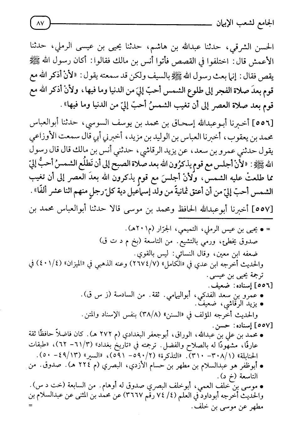 556 - أَخْبَرَنَا أَبُو عَبْدِ اللهِ، إِسْحَاقُ بْنُ مُحَمَّدِ بْنِ يُوسُفَ السُّوسِيُّ حدثنا أَبُو الْعَبَّاسِ مُحَمَّدُ بْنُ يَعْقُوبَ، أَخْبَرَنَا الْعَبَّاسُ بْنُ الْوَلِيدِ بْنِ مَزْيَدَ، أَخْبَرَنِي أَبِي قَالَ: سَمِعْتُ الْأَوْزَاعِيَّ يَقُولُ: حَدَّثَنِي عَمْرُو بْنُ سَعْدٍ، عَنْ يَزِيدَ الرَّقَاشِيِّ، حَدَّثَنِي أَنَسُ بْنُ مَالِكٍ، قَالَ: قَالَ رَسُولُ اللهِ صَلَّى اللَّهُ عَلَيْهِ وَسَلَّمَ: " §لَأَنْ أَجْلِسَ مَعَ قَوْمٍ يَذْكُرُونَ اللهَ بَعْدَ صَلَاةِ الصُّبْحِ، إِلَى أَنْ تَطْلُعَ الشَّمْسُ أَحَبُّ إِلَيَّ مِمَّا طَلَعَتْ عَلَيْهِ الشَّمْسُ، وَلَأَنْ أَجْلِسَ مَعَ قَوْمٍ يَذْكُرُونَ اللهَ بَعْدَ الْعَصْرِ إِلَى أَنْ تَغِيبَ الشَّمْسُ أَحَبُّ إِلَيَّ مِنْ أَنْ أُعْتِقَ ثَمَانِيَةً مِنْ وَلَدِ إِسْمَاعِيلَ دِيَةُ كُلِّ رَجُلٍ مِنْهُمُ اثْنَا عَشَرَ أَلْفًا "