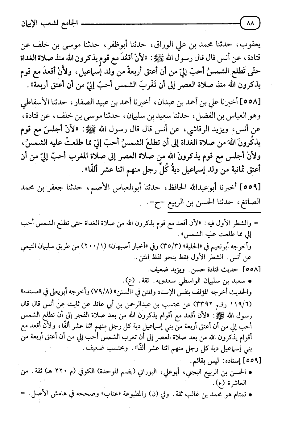 558 - أَخْبَرَنَا عَلِيُّ بْنُ أَحْمَدَ بْنِ عَبْدَانَ، أَخْبَرَنَا أَحْمَدُ بْنُ عُبَيْدٍ الصَّفَّارُ، حدثنا الْأَسْفَاطِيُّ وَهُوَ الْعَبَّاسُ بْنُ الْفَضْلِ حدثنا سَعِيدُ بْنُ سُلَيْمَانَ، حدثنا مُوسَى بْنُ خَلَفٍ، عَنْ قَتَادَةَ، عَنْ أَنَسٍ، وَيَزِيدَ الرَّقَاشِيِّ، عَنْ أَنَسٍ قَالَ: قَالَ رَسُولُ اللهِ صَلَّى اللَّهُ عَلَيْهِ وَسَلَّمَ: §" لَأَنْ أَجْلِسَ مَعَ قَوْمٍ يَذْكُرُونَ اللهَ مِنْ صَلَاةِ الْغَدَاةِ إِلَى أَنْ تَطْلُعَ الشَّمْسُ أَحَبُّ إِلَيَّ مِمَّا طَلَعَتْ عَلَيْهِ الشَّمْسُ، وَلَأَنْ أَجْلِسَ مَعَ قَوْمٍ يَذْكُرُونَ اللهَ مِنْ صَلَاةِ الْعَصْرِ إِلَى صَلَاةِ الْمَغْرِبِ أَحَبُّ إِلَيَّ مِنْ أَنْ أُعْتِقَ ثَمَانِيَةً مِنْ وَلَدِ إِسْمَاعِيلَ دِيَةُ كُلِّ رَجُلٍ مِنْهُمُ اثْنَا عَشَرَ أَلْفًا "