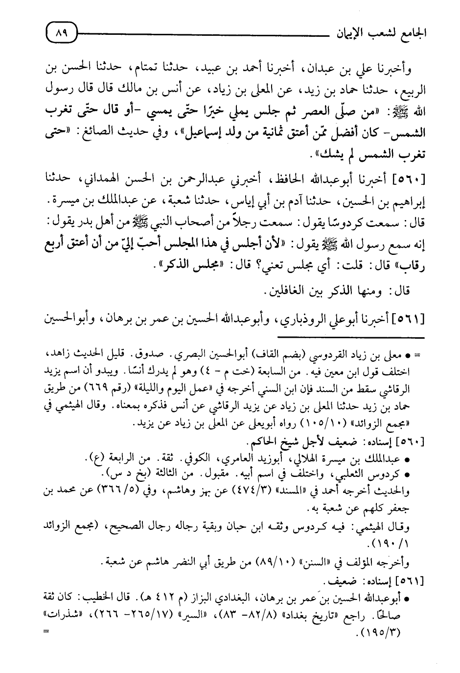 560 - أَخْبَرَنَا أَبُو عَبْدِ اللهِ الْحَافِظُ، أَخْبَرَنِي عَبْدُ الرَّحْمَنِ بْنُ الْحَسَنِ الْهَمْدَانِيُّ، حدثنا إِبْرَاهِيمُ بْنُ الْحُسَيْنِ، حدثنا آدَمُ بْنُ أَبِي إِيَاسٍ، حدثنا شُعْبَةُ، عَنْ عَبْدِ الْمَلِكِ بْنِ مَيْسَرَةَ قَالَ: سَمِعْتُ كُرْدُوسًا يَقُولُ: سَمِعْتُ رَجُلًا، مِنْ أَصْحَابِ النَّبِيِّ صَلَّى اللَّهُ عَلَيْهِ وَسَلَّمَ مِنْ أَهْلِ بَدْرٍ يَقُولُ: إِنَّهُ سَمِعَ رَسُولَ اللهِ صَلَّى اللَّهُ عَلَيْهِ وَسَلَّمَ يَقُولُ: §" لَأَنْ أَجْلِسَ فِي هَذَا الْمَجْلِسِ أَحَبُّ إِلَيَّ مِنْ أَنْ أُعْتِقَ أَرْبَعَ رِقَابٍ قَالَ: قُلْتُ: أَيُّ مَجْلِسٍ تَعْنِي؟ قَالَ: مَجْلِسُ الذِّكْرِ قَالَ: وَمِنْهَا الذِّكْرُ بَيْنَ الْغَافِلِينَ "