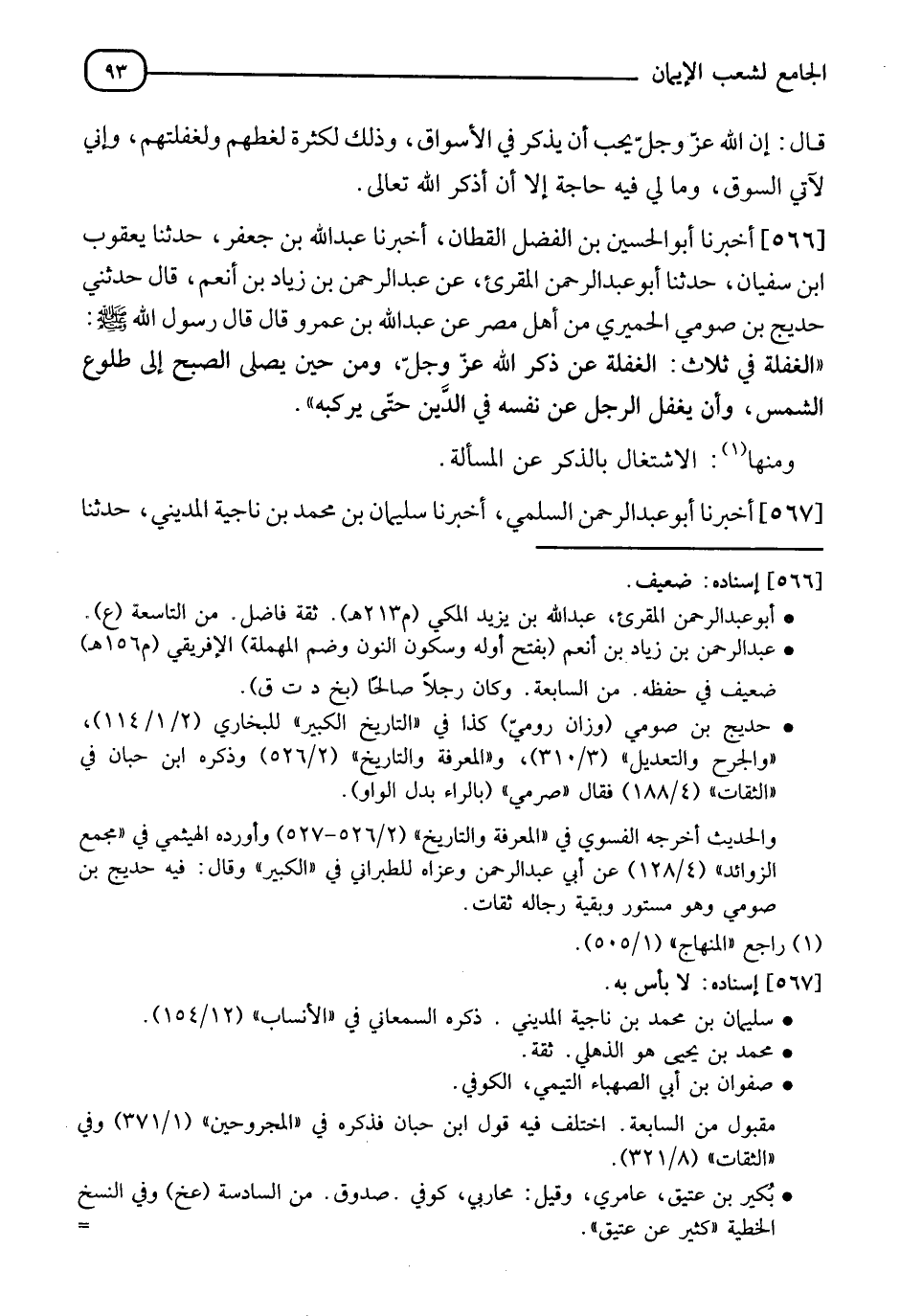 566 - أَخْبَرَنَا أَبُو الْحُسَيْنِ بْنُ الْفَضْلِ الْقَطَّانُ، أَخْبَرَنَا عَبْدُ اللهِ بْنُ جَعْفَرٍ، حدثنا يَعْقُوبُ بْنُ سُفْيَانَ، حدثنا أَبُو عَبْدِ الرَّحْمَنِ الْمُقْرِئُ، عَنْ عَبْدِ الرَّحْمَنِ بْنِ زِيَادِ بْنِ أَنْعَمَ قَالَ: حَدَّثَنِي حُدَيْجُ بْنُ صَوْمِيٍّ الْحِمْيَرِيُّ، مِنْ أَهْلِ مِصْرَ، عَنْ عَبْدِ اللهِ بْنِ عَمْرٍو قَالَ: قَالَ رَسُولُ اللهِ صَلَّى اللَّهُ عَلَيْهِ وَسَلَّمَ: " §الْغَفْلَةُ فِي ثَلَاثٍ: الْغَفْلَةُ عَنْ ذِكْرِ اللهِ عَزَّ وَجَلَّ، وَمِنْ حِينِ يُصَلِّي الصُّبْحَ إِلَى طُلُوعِ الشَّمْسِ، وَأَنْ يَغْفُلَ الرَّجُلُ عَنْ نَفْسِهِ فِي الدِّينِ حَتَّى يَرْكَبَهُ، وَمِنْهَا الِاشْتِغَالُ بِالذِّكْرِ عَنِ الْمَسْأَلَةِ "