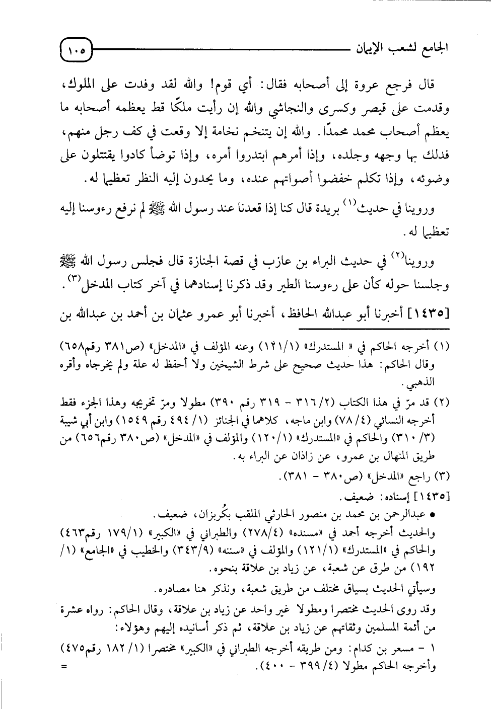 1435 - أَخْبَرَنَا أَبُو عَبْدِ اللهِ الْحَافِظُ، أخبرنا أَبُو عَمْرٍو عُثْمَانُ بْنُ أَحْمَدَ بْنِ عَبْدِ اللهِ بْنِ -[106]- السَّمَّاكِ، حدثنا عَبْدُ الرَّحْمَنِ بْنُ مُحَمَّدِ بْنِ مَنْصُورٍ الْحَارِثِيُّ، حدثنا سَعِيدُ بْنُ عَامِرٍ، قَالَ: -[107]- حدثنا شُعْبَةُ، عَنْ زِيَادِ بْنِ عِلَاقَةَ، عَنْ أُسَامَةَ بْنِ شَرِيكٍ، قَالَ: أَتَيْتُ رَسُولَ اللهِ صَلَّى اللَّهُ عَلَيْهِ وَسَلَّمَ، وَعِنْدَهُ أَصْحَابُهُ كَأَنَّمَا عَلَى رُءُوسِهِمُ الطَّيْرُ فَسَلَّمْتُ وَقَعَدَتْ، قَالَ: فَجَاءَتِ الْأَعْرَابُ، وَقَالُوا: يَا رَسُولَ اللهِ، عَلَيْنَا حَرَجٌ فِي كَذَا أَشْيَاءَ، لَا بَأْسَ بِهَا؟ قَالَ: " عِبَادَ اللهِ، §وَضَعَ اللهُ الْحَرَجَ إِلَّا امْرَءًا أَقْرَضَ امْرَأً مُسْلِمًا ظُلْمًا، فَذَلِكَ الَّذِي حُرِجَ وَأَهْلَكَ "