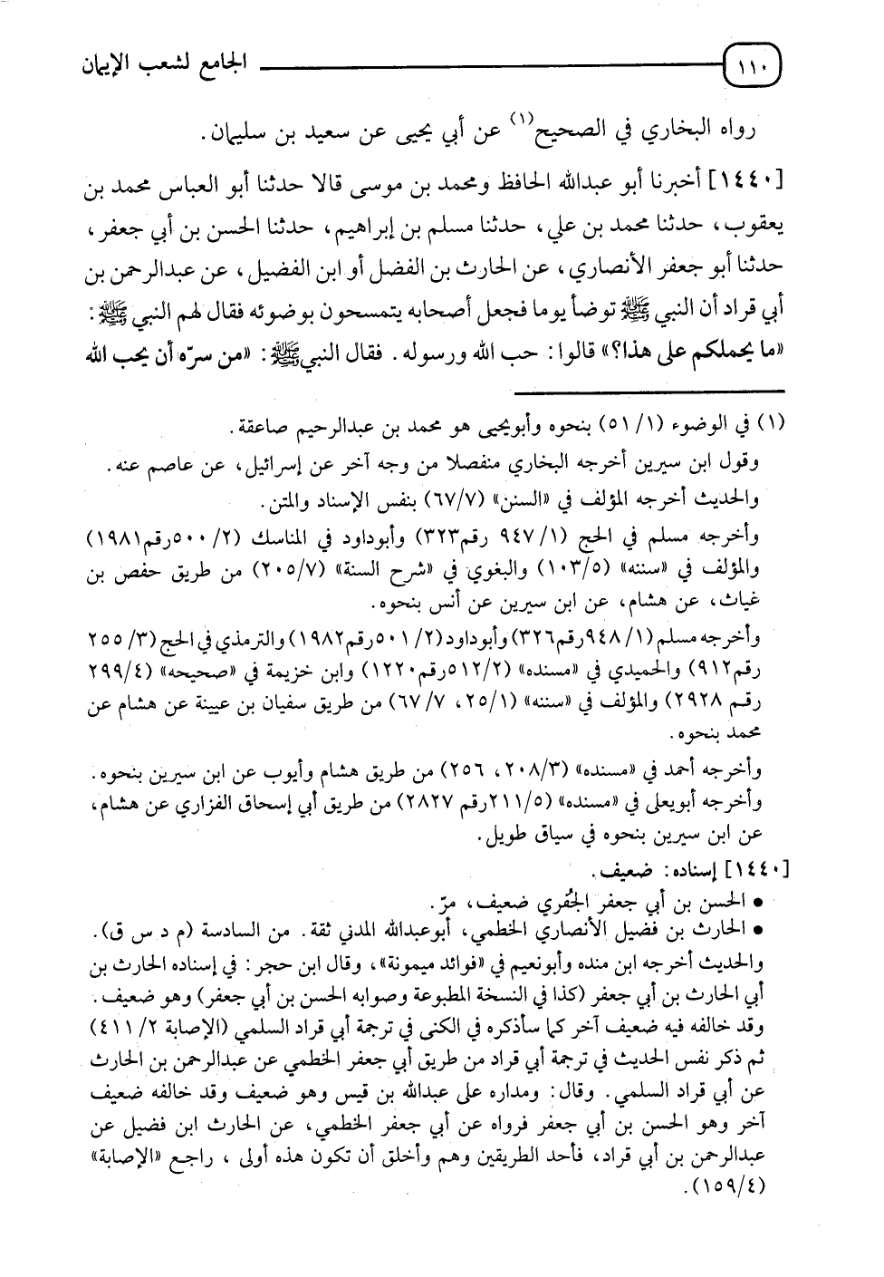 1440 - أَخْبَرَنَا أَبُو عَبْدِ اللهِ الْحَافِظُ، وَمُحَمَّدُ بْنُ مُوسَى، قَالَا: حدثنا أَبُو الْعَبَّاسِ مُحَمَّدُ بْنُ يَعْقُوبَ، حدثنا مُحَمَّدُ بْنُ عَلِيٍّ، حدثنا مُسْلِمُ بْنُ إِبْرَاهِيمَ، حدثنا الْحَسَنُ بْنُ أَبِي جَعْفَرٍ، حدثنا أَبُو جَعْفَرٍ الْأَنْصَارِيُّ، عَنِ الْحَارِثِ بْنِ الْفَضْلِ أَوْ ابْنِ الْفُضَيْلِ، عَنْ عَبْدِ الرَّحْمَنِ بْنِ أَبِي قُرَادٍ، أَنَّ النَّبِيَّ صَلَّى اللَّهُ عَلَيْهِ وَسَلَّمَ تَوَضَّأَ يَوْمًا فَجَعَلَ أَصْحَابُهُ يَتَمَسَّحُونَ بِوَضُوئِهِ، فَقَالَ لَهُمُ النَّبِيُّ صَلَّى اللَّهُ عَلَيْهِ وَسَلَّمَ: " مَا يَحْمِلُكُمْ عَلَى هَذَا؟ " قَالُوا: حُبُّ اللهِ وَرَسُولِهِ، فَقَالَ النَّبِيُّ صَلَّى اللَّهُ عَلَيْهِ وَسَلَّمَ: " §مَنْ سَرَّهُ أَنْ يُحِبَّ اللهَ -[111]- وَرَسُولَهُ، أَوْ يُحِبَّهُ اللهُ وَرَسُولُهُ فَلْيَصْدُقْ حَدِيثَهُ إِذَا حَدَّثَ، وَلْيُؤَدِّ أَمَانَتَهُ إِذَا ائْتُمِنَ، وَلْيُحْسِنْ جِوَارَ مَنْ جَاوَرَهُ "