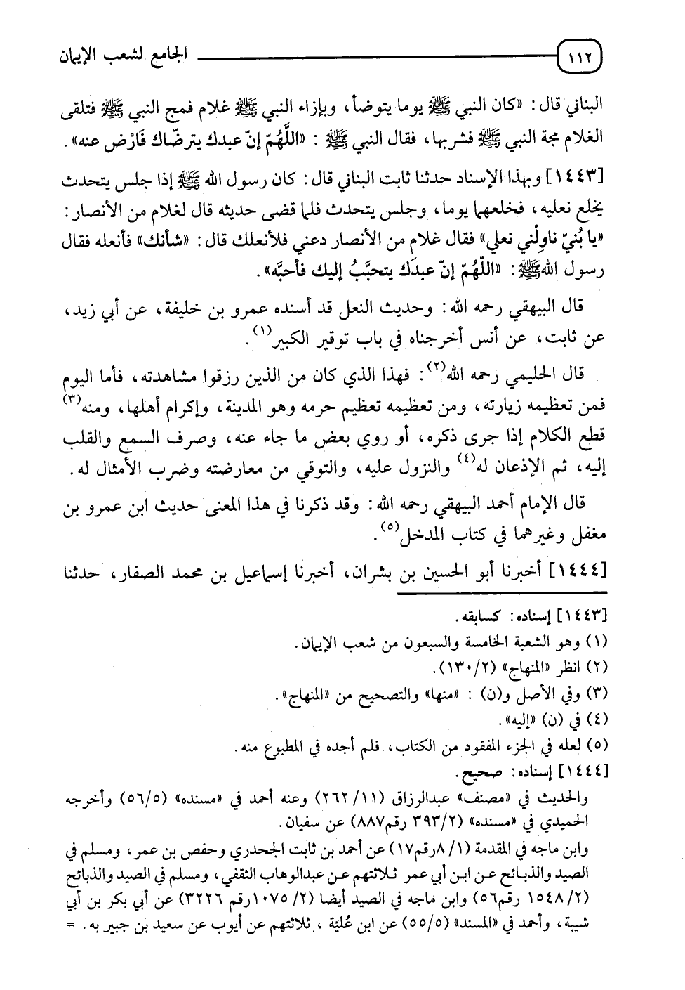 1443 - وَبِهَذَا الْإِسْنَادِ حدثنا ثَابِتٌ الْبُنَانِيُّ، قَالَ: كَانَ رَسُولُ اللهِ صَلَّى اللَّهُ عَلَيْهِ وَسَلَّمَ إِذَا جَلَسَ يَتَحَدَّثُ يَخْلَعُ نَعْلَيْهِ، فَخَلَعَهمَا يَوْمًا وَجَلَسَ يَتَحَدَّثُ، فَلَمَّا قَضَى حَدِيثَهُ، قَالَ لِغُلَامٍ مِنَ الْأَنْصَارِ: " يَا بُنَيَّ، نَاوِلْنِي نَعْلِي ". فَقَالَ غُلَامٌ مِنَ الْأَنْصَارِ: دَعْنِي فَلْأُنْعِلْكَ قَالَ: " شَأْنَكَ فأنعله "، فَقَالَ رَسُولُ اللهِ صَلَّى اللَّهُ عَلَيْهِ وَسَلَّمَ: " اللهُمَّ، إِنَّ §عَبْدَكَ يَتَحَبَّبُ إِلَيْكَ فَأَحِبَّهُ " قَالَ الْبَيْهَقِيُّ رَحِمَهُ اللهُ: " وَحَدِيثُ النَّعْلِ قَدْ أَسْنَدَهُ عَمْرُو بْنُ خَلِيفَةَ، عَنْ أَبِي زَيْدٍ، عَنْ ثَابِتٍ، عَنْ أَنَسٍ أَخْرَجْنَاهُ فِي بَابِ تَوْقِيرِ الْكَبِيرِ " قَالَ الْحَلِيمِيُّ رَحِمَهُ اللهُ: فَهَذَا الذي كَانَ مِنَ الَّذِينَ رُزِقُوا مُشَاهَدَتَهُ، فَأَمَّا الْيَوْمَ، فَمِنْ تَعْظِيمِهِ زِيَارَتُهُ، وَمِنْ تَعْظِيمِهِ تَعْظِيمُ حَرَمِهِ، وَهُوَ الْمَدِينَةُ وَإِكْرَامُ أَهْلِهَا، وَمِنْهُ قَطْعُ الْكَلَامِ إِذَا جَرَى ذِكْرُهُ أَوْ رُوِيَ بَعْضُ مَا جَاءَ عَنْهُ، وَصَرْفُ السَّمْعِ وَالْقَلْبِ إِلَيْهِ، ثُمَّ الْإِذْعَانُ له وَالنُّزُولُ عَلَيْهِ، وَالتَّوَقِي مِنْ مُعَارَضَتِهِ وَضَرْبِ الْأَمْثَالِ لَهُ قَالَ الْإِمَامُ أَحْمَدُ الْبَيْهَقِيُّ رَحِمَهُ اللهُ: " وَقَدْ ذَكَرْنَا فِي هَذَا الْمَعْنَى حَدِيثَ ابْنِ عَمْرِو بْنِ مُغَفَّلٍ وَغَيْرِهِمَا فِي كِتَابِ الْمَدْخَلِ "