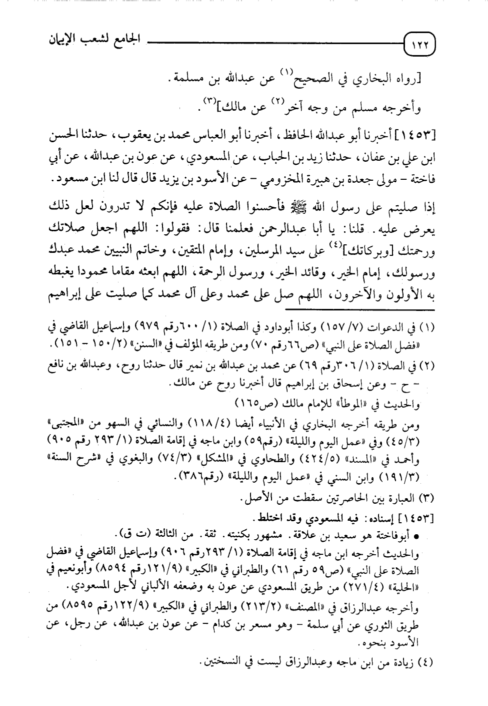 1453 - أَخْبَرَنَا أَبُو عَبْدِ اللهِ الْحَافِظُ، أخبرنا أَبُو الْعَبَّاسِ مُحَمَّدُ بْنُ يَعْقُوبَ، حدثنا الْحَسَنِ بْنِ عَلِيِّ بْنِ عَفَّانَ، حدثنا زَيْدُ بْنُ الْحُبَابِ، عَنِ الْمَسْعُودِيِّ، عَنْ عَوْنِ بْنِ عَبْدِ اللهِ، عَنْ أَبِي فَاخِتَةَ مَوْلَى جَعْدَةَ بْنِ هُبَيْرَةَ الْمَخْزُومِيِّ، عَنِ الْأَسْوَدِ بْنِ يَزِيدَ، قَالَ: قَالَ لَنَا ابْنُ مَسْعُودٍ: §" إِذَا صَلَّيْتُمْ عَلَى رَسُولِ اللهِ صَلَّى اللَّهُ عَلَيْهِ وَسَلَّمَ فَأَحْسِنُوا الصَّلَاةَ عَلَيْهِ، فَإِنَّكُمْ لَا تَدْرُونَ لَعَلَّ ذَلِكَ يُعْرَضُ عَلَيْهِ قُلْنَا: يَا أَبَا عَبْدِ الرَّحْمَنِ فَعَلِّمْنَا قَالَ: فقُولُوا: اللهُمَّ اجْعَلْ صَلاتِكَ وَرَحْمَتَكَ وبركاتك عَلَى سَيِّدِ الْمُرْسَلِينَ، وَإِمَامِ الْمُتَّقِينَ، وَخَاتَمِ النَّبِيِّينَ مُحَمَّدٍ عَبْدِكَ وَرَسُولِكَ، إِمَامِ الْخَيْرِ، وَقَائِدِ الْخَيْرِ، وَرَسُولِ الرَّحْمَةِ، اللهُمَّ ابْعَثْهُ مَقَامًا مَحْمُودًا يَغْبِطُهُ بِهِ الْأَوَّلُونَ وَالْآخِرُونَ، اللهُمَّ صَلِّ عَلَى مُحَمَّدٍ وَعلى آلِ مُحَمَّدٍ كَمَا صَلَّيْتَ عَلَى إِبْرَاهِيمَ -[123]- وَعَلَى آلِ إِبْرَاهِيمَ إِنَّكَ حَمِيدٌ مَجِيدٌ وبارك على محمد وعلى آل محمد كما باركت على إبراهيم وآل إبراهيم إنك حميد مجيد. " وَقَدْ رُوِّينَا مِنْ وَجْهٍ صَحِيحٍ فِي حَدِيثِ كَعْبِ بْنِ عُجْرَةَ، عَنِ النَّبِيِّ صَلَّى اللَّهُ عَلَيْهِ وَسَلَّمَ فِي كَيْفِيَّةِ الصَّلَاةِ عَلَى النَّبِيِّ صَلَّى اللَّهُ عَلَيْهِ وَسَلَّمَ " مِثْلَ مَا رُوِّينَا عَنِ ابْنِ مَسْعُودٍ مِنْ قَوْلِهِ: " اللهُمَّ صَلِّ عَلَى مُحَمَّدٍ " إِلَى آخِرِهِ، وَذَكَرَ فِيهِ إِبْرَاهِيمَ، وَآلَ إِبْرَاهِيمَ، وَهُوَ وإِنْ لَمْ يُذْكَرْ فِي بَعْضِ طُرُقِ هَذِهِ الْأَحَادِيثِ فَهُوَ دَاخِلٌ فِيهِ كِقَوْلهِ تَعَالَى: {أَدْخِلُوا آلَ فِرْعَوْنَ أَشَدَّ الْعَذَابِ} [غافر: 46]: وَفِرْعَوْنُ دَاخِلٌ فِيهِ مَعَ آلِهِ " وَذَكَرَ الْحَلِيمِيُّ رَحِمَهُ اللهُ فِي مَعْنَى هَذَا التَّشْبِيهِ أَنَّ اللهَ عَزَّ وَجَلَّ: " أَخْبَرَ أَنَّ الْمَلَائِكَةَ قَالَتْ فِي بَيْتِ إِبْرَاهِيمَ مُخَاطَبَةً لِسَارَةَ: رَحْمَةُ اللهِ وَبَرَكَاتُهُ عَلَيْكُمْ أَهْلَ الْبَيْتِ، إِنَّهُ حَمِيدٌ مَجِيدٌ، وَقَدْ عَلِمْنَا أَنَّ نَبِيَّنَا صَلَّى اللَّهُ عَلَيْهِ وَسَلَّمَ مِنْ أَهْلِ بَيْتِ إِبْرَاهِيمَ، وَكَذَلِكَ آلُهُ كُلُّهُمْ، فَمَعْنَى قَوْلِنَا: اللهُمَّ صَلِّ أَوْ بَارِكْ عَلَى مُحَمَّدٍ، وَعَلَى آلِ مُحَمَّدٍ، كَمَا صَلَّيْتَ أَوْ بَارَكْتَ عَلَى إِبْرَاهِيمَ، وَآلِ إِبْرَاهِيمَ أَيْ أَجِبْ دُعَاءَ مَلَائِكَتِكَ الَّذِينَ دُعَوْا لِآلِ إِبْرَاهِيمَ، فَقَالُوا: رَحْمَةُ اللهِ وَبَرَكَاتُهُ عَلَيْكُمْ أَهْلَ الْبَيْتِ، وَفِي مُحَمَّدٍ، وَآلِ مُحَمَّدٍ، كَمَا أَجَبْتَهُ فِي الْمَوْجُودِينَ الذين كَانُوا يَوْمَئِذٍ مِنْ أَهْلِ بَيْتِ إِبْرَاهِيمَ، فَإِنَّهُ وَآلَهُ مِنْ أَهْلِ بَيْتِهِ أَيْضًا وكِذَلِكَ يُخْتَمُ على هَذَا الدُّعَاءُ بِأَنْ يَقُولُ: إِنَّكَ حَمِيدٌ مَجِيدٌ، فَإِنَّ الْمَلَائِكَةَ خَتَمَتْ دُعَاءَهَا بِقَوْلِهِمْ إِنَّكَ حَمِيدٌ مَجِيدٌ " قَالَ الْإِمَامُ أَحْمَدُ الْبَيْهَقِيُّ رَحِمَهُ اللهُ: " وَقَدْ ذَكَرْنَا سَائِرَ مَا وَرَدَ فِي كَيْفِيَّةِ الصَّلَاةِ عَلَى نَبِيِّنَا مُحَمَّدٍ صَلَّى اللَّهُ عَلَيْهِ وَسَلَّمَ فِي فَضْلِ الصَّلَاةِ وَالسَّلَامِ عَلَيْهِ فِي كِتَابِ الدَّعَوَاتِ وَالسُّنَنِ، مَنْ أَرَادَ الْوُقُوفَ عَلَيْهَا رَجَعَ إِلَيْهَا إِنْ شَاءَ اللهُ تَعَالَى، وَنَحْنُ نَذْكُرُ هَهُنَا طَرَفًا مِنْهَا تَرْغَيبًا فَيْهَا وَبِاللهِ التَّوْفِيقُ "