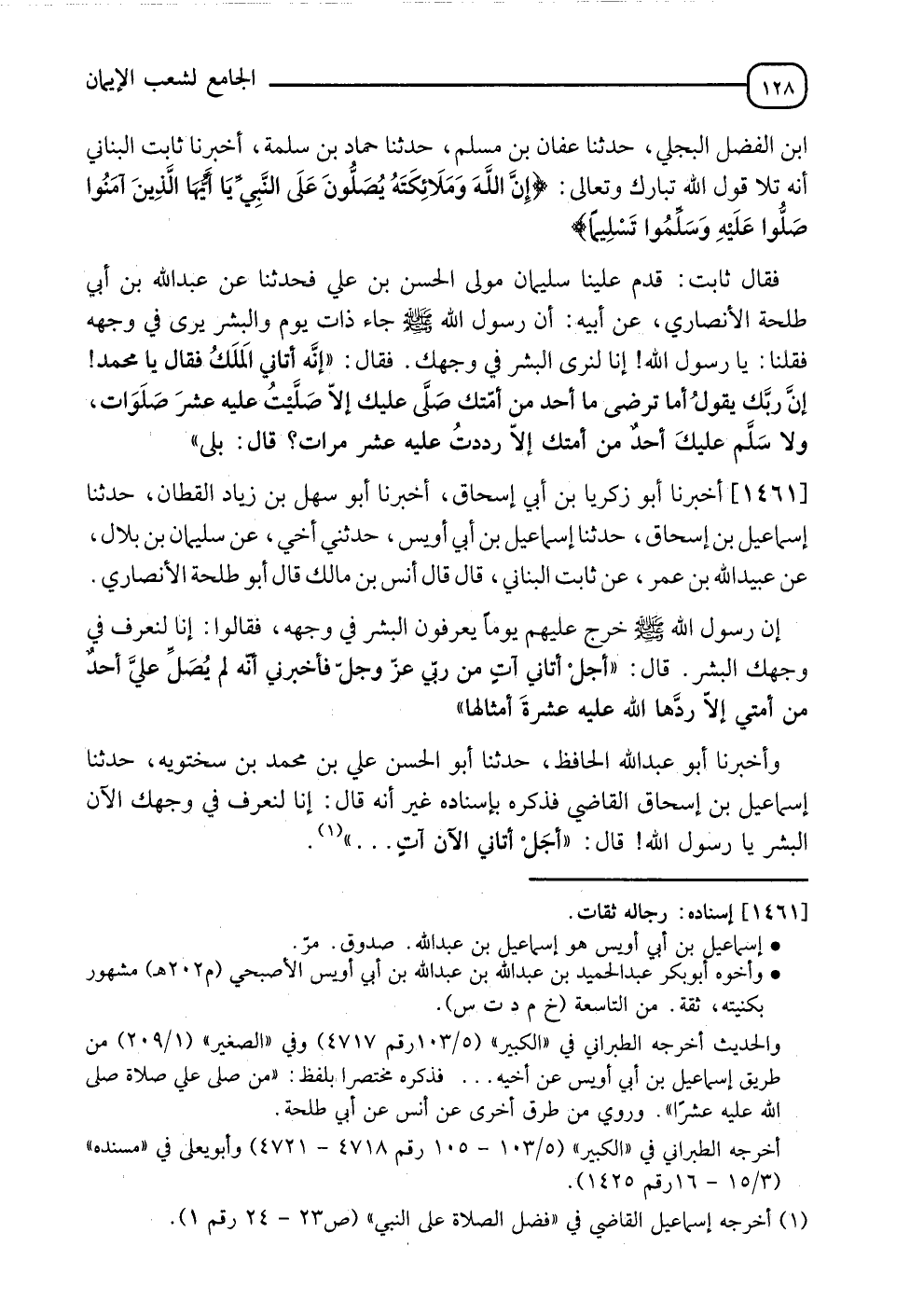 1461 - أَخْبَرَنَا أَبُو زَكَرِيَّا بْنُ أَبِي إِسْحَاقَ، أخبرنا أَبُو سَهْلِ بْنُ زِيَادٍ الْقَطَّانُ، حدثنا إِسْمَاعِيلُ بْنُ إِسْحَاقَ، حدثنا إِسْمَاعِيلُ بْنُ أَبِي أُوَيْسٍ، حَدَّثَنِي أَخِي، عَنْ سُلَيْمَانَ بْنِ بِلَالٍ، عَنْ عُبَيْدِ اللهِ بْنِ عُمَرَ، عَنْ ثَابِتٍ الْبُنَانِيِّ، قَالَ: قَالَ أَنَسُ بْنُ مَالِكٍ: قَالَ أَبُو طَلْحَةَ الْأَنْصَارِيُّ: إِنَّ رَسُولَ اللهِ صَلَّى اللَّهُ عَلَيْهِ وَسَلَّمَ خَرَجَ عَلَيْهِمْ يَوْمًا يَعْرِفُونَ الْبِشْرَ فِي وَجْهِهِ، فَقَالُوا: إِنَّا لَنَعْرِفُ فِي وَجْهِكَ الْبِشْرَ قَالَ: " أَجَلْ، §أَتَانِي آتٍ مِنْ رَبِّي عَزَّ وَجَلَّ فَأَخْبَرَنِي أَنَّهُ لَمْ يُصَلِّ عَلَيَّ أَحَدٌ مِنْ أُمَّتِي إِلَّا رَدَّهَا اللهُ عَلَيْهِ عَشْرَةَ أَمْثَالِهَا " وأَخْبَرَنَا أَبُو عَبْدِ اللهِ الْحَافِظُ، حدثنا أَبُو الْحَسَنِ عَلِيُّ بْنُ مُحَمَّدِ بْنِ سَخْتَوَيْهِ، حدثنا إِسْمَاعِيلُ بْنُ إِسْحَاقَ الْقَاضِي، فَذَكَرَهُ بِإِسْنَادِهِ غَيْرَ أَنَّهُ قَالَ: إِنَّا لَنَعْرِفُ فِي وَجْهِكَ الْآنَ الْبِشْرَ يَا رَسُولَ اللهِ، قَالَ: " أَجَلْ أَتَانِي الْآنَ آتٍ "