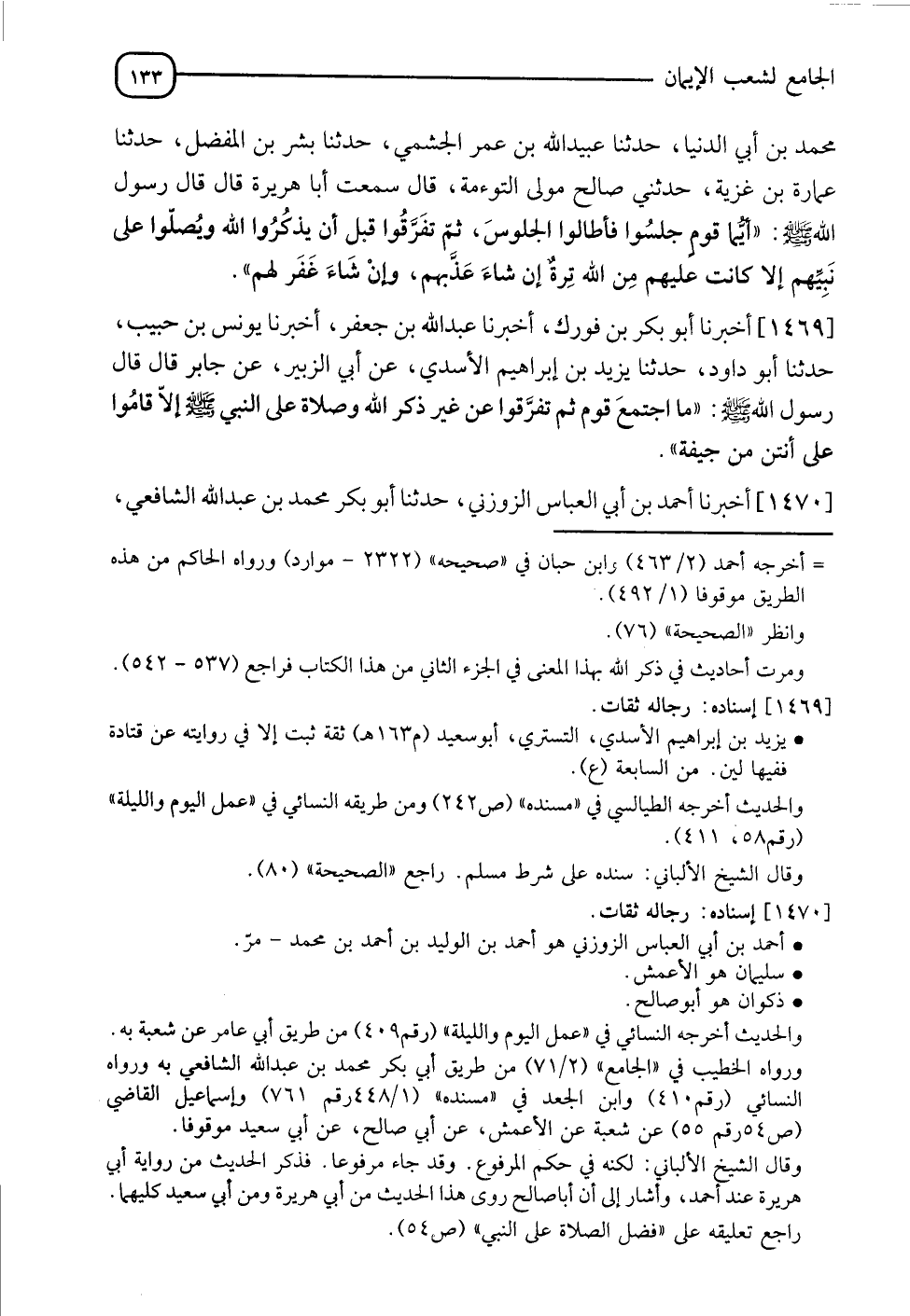 1470 - أَخْبَرَنَا أَحْمَدُ بْنُ أَبِي الْعَبَّاسِ الزَّوْزَنِيُّ، حدثنا أَبُو بَكْرٍ مُحَمَّدُ بْنُ عَبْدِ اللهِ الشَّافِعِيُّ، -[134]- حدثنا مُحَمَّدُ بْنُ مَسْلَمَةَ الْوَاسِطِيُّ، حدثنا يَزِيدُ بْنُ هَارُونَ، حدثنا شُعْبَةُ، عَنْ سُلَيْمَانَ، عَنْ ذَكْوَانَ، عَنْ أَبِي سَعِيدٍ الْخُدْرِيِّ، عَنِ النَّبِيِّ صَلَّى اللَّهُ عَلَيْهِ وَسَلَّمَ قَالَ: §" لَا يَجْلِسُ قَوْمٌ مَجْلِسًا لَا يُصَلُّونَ فِيهِ عَلَى رَسُولِ اللهِ صَلَّى اللَّهُ عَلَيْهِ وَسَلَّمَ إِلَّا كَانَ عَلَيْهِمْ حَسْرَةٌ، وَإِنْ دَخَلُوا الْجَنَّةَ لِمَا يَرَوْنَ مِنَ الثَّوَابِ "