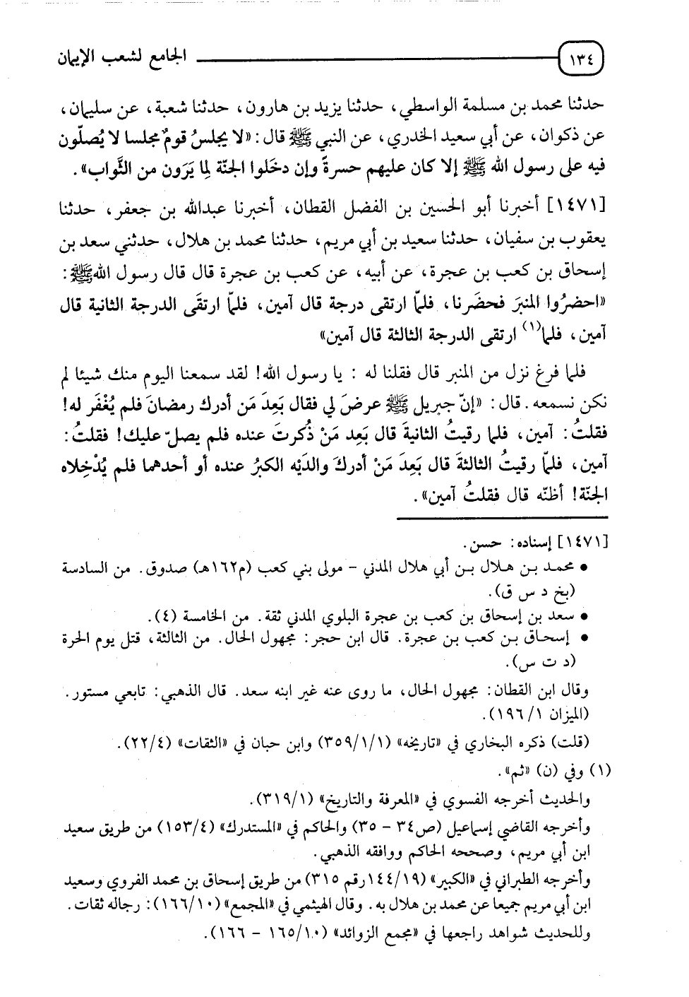1471 - أَخْبَرَنَا أَبُو الْحُسَيْنِ بْنُ الْفَضْلِ الْقَطَّانُ، أخبرنا عَبْدُ اللهِ بْنُ جَعْفَرٍ، حدثنا يَعْقُوبُ بْنُ سُفْيَانَ، حدثنا سَعِيدُ بْنُ أَبِي مَرْيَمَ، حدثنا مُحَمَّدُ بْنُ هِلَالٍ، حَدَّثَنِي سَعْدُ بْنُ إِسْحَاقَ بْنِ كَعْبِ بْنِ عُجْرَةَ، عَنْ أَبِيهِ، عَنْ كَعْبِ بْنِ عُجْرَةَ، قَالَ: قَالَ رَسُولُ اللهِ صَلَّى اللَّهُ عَلَيْهِ وَسَلَّمَ: " احْضُرُوا الْمِنْبَرَ " فَحَضَرْنَا، فَلَمَّا ارْتَقَى دَرَجَةً قَالَ: " آمِينَ "، فَلَمَّا ارْتَقَى الدَّرَجَةَ الثَّانِيَةَ قَالَ: " آمِينَ "، فَلَمَّا ارْتَقَى الدَّرَجَةَ الثَّالِثَةَ قَالَ: " آمِينَ "، فَلَمَّا فَرَغَ نَزَلَ مِنَ الْمِنْبَرِ قَالَ: فَقُلْنَا له يَا رَسُولَ اللهِ لَقَدْ سَمِعْنَا الْيَوْمَ مِنْكَ شَيْئًا لَمْ نَكُنْ نَسْمَعُهُ قَالَ: " إِنَّ §جِبْرِيلَ عَلَيْهِ السَّلَامِ عَرْضَ لِي فَقَالَ: بَعُدَ مَنْ أَدْرَكَ رَمَضَانَ فَلَمْ يُغْفَرْ لَهُ فَقُلْتُ: آمِينَ فَلَمَّا رَقِيتُ الثَّانِيَةَ قَالَ: بَعُدَ مَنْ ذُكِرْتَ عِنْدَهُ فَلَمْ يُصَلِّ عَلَيْكَ فَقُلْتُ: آمِينَ، فَلَمَّا رَقِيتُ الثَّالِثَةَ قَالَ: بَعُدَ مَنْ أَدْرَكَ وَالِدَيْهِ الْكِبَرَ عِنْدَهُ أَوْ أَحَدُهُمَا، فلَمْ يُدْخِلَاهُ الْجَنَّةَ - أَظُنُّهُ قَالَ - فَقُلْتُ: آمِينَ "