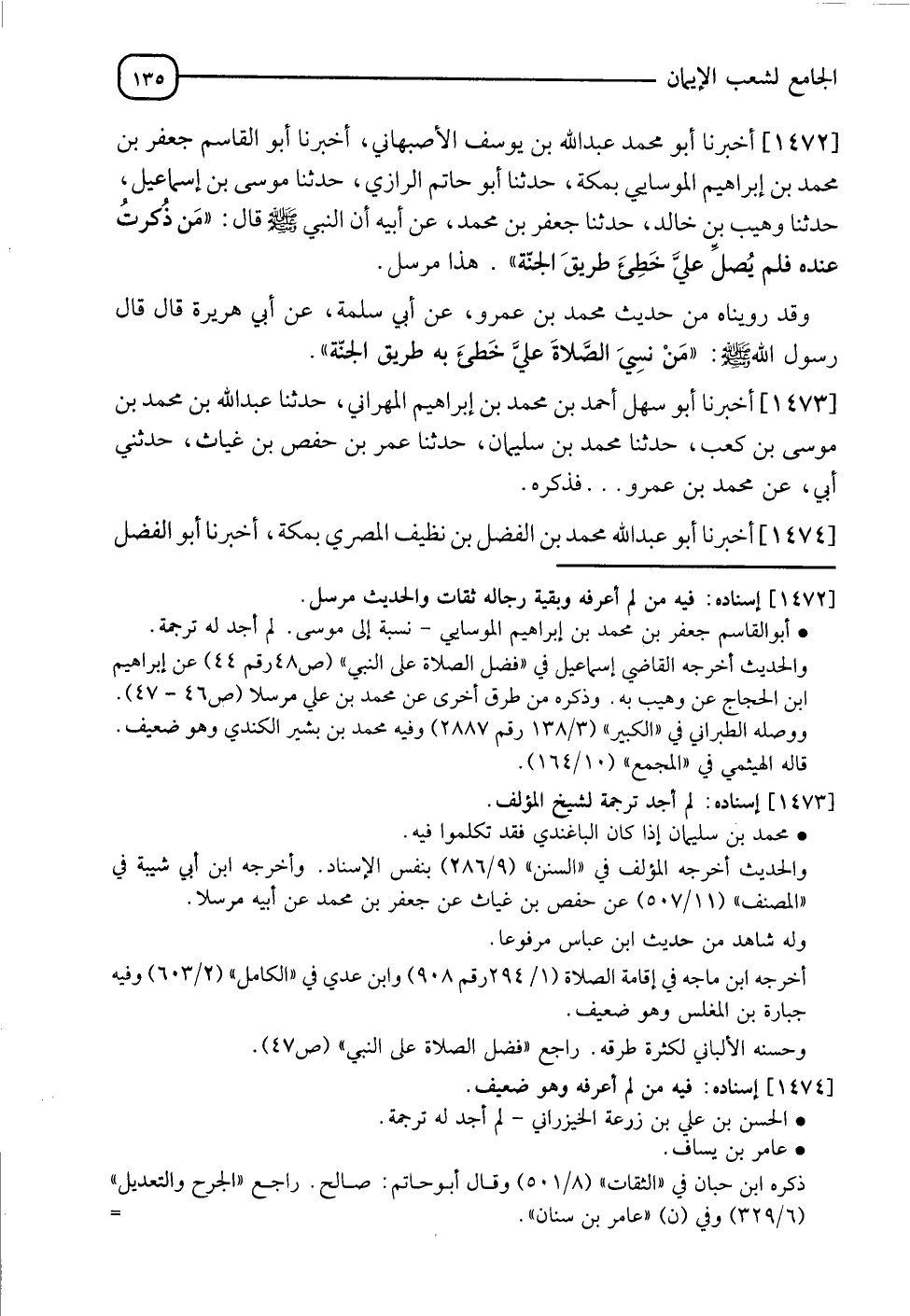 1472 - أَخْبَرَنَا أَبُو مُحَمَّدٍ عَبْدُ اللهِ بْنُ يُوسُفَ الْأَصْبَهَانِيُّ، أخبرنا أَبُو الْقَاسِمِ جَعْفَرُ بْنُ مُحَمَّدِ بْنِ إِبْرَاهِيمَ الْمُوسَوِيُّ بِمَكَّةَ، حدثنا أَبُو حَاتِمٍ الرَّازِيُّ، حدثنا مُوسَى بْنُ إِسْمَاعِيلَ، حدثنا وُهَيْبُ بْنُ خَالِدٍ، حدثنا جَعْفَرُ بْنُ مُحَمَّدٍ، عَنْ أَبِيهِ، أَنَّ النَّبِيَّ صَلَّى اللَّهُ عَلَيْهِ وَسَلَّمَ قَالَ: §" مَنْ ذُكِرْتُ عِنْدَهُ فَلَمْ يُصَلِّ عَلَيَّ خَطِئَ طَرِيقَ الْجَنَّةِ " " هَذَا مُرْسَلٌ "، وَقَدْ رُوِّينَاهُ مِنْ
