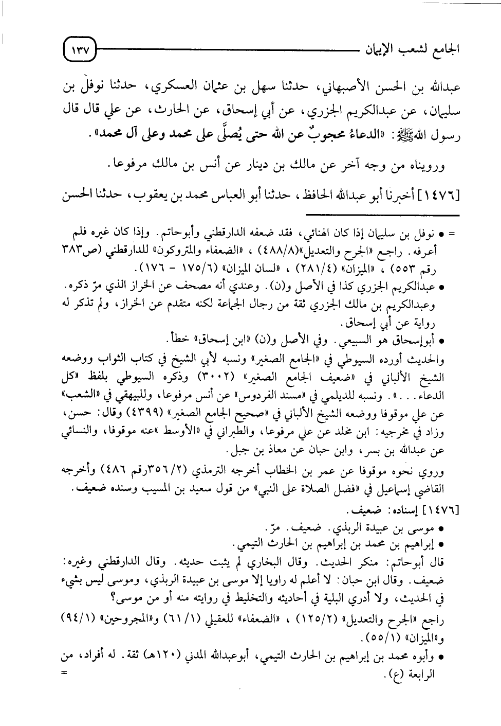 1476 - أَخْبَرَنَا أَبُو عَبْدِ اللهِ الْحَافِظُ، حدثنا أَبُو الْعَبَّاسِ مُحَمَّدُ بْنُ يَعْقُوبَ، حدثنا الْحَسَنُ -[138]- بْنُ عَلِيِّ بْنِ عَفَّانَ، حدثنا زَيْدُ بْنُ الْحُبَابِ، حدثنا مُوسَى بْنُ عُبَيْدَةَ الرَّبَذِيُّ، حَدَّثَنِي إِبْرَاهِيمُ بْنُ مُحَمَّدِ بْنِ إِبْرَاهِيمَ التَّيْمِيُّ وَكَانَ جَدُّهُ مِنَ الْمُهَاجِرِينَ الْأَوَّلِينَ، عَنْ أَبِيهِ، عَنْ جَابِرِ بْنِ عَبْدِ اللهِ الْأَنْصَارِيِّ، قَالَ: قَالَ رَسُولُ اللهِ صَلَّى اللَّهُ عَلَيْهِ وَسَلَّمَ: " §لَا تَجْعَلُونِي كَقَدَحِ الرَّاكِبِ، إِنَّ الرَّاكِبَ يَمْلَأُ قَدَحَهُ مَاءً ثُمَّ يَضَعُهُ، ثُمَّ يَأْخُذُ فِي مَعَالِيقِهِ حَتَّى إِذَا فَرَغَ جَاءَ إِلَى الْقَدَحِ، فَإِنْ كَانَ لَهُ حَاجَةٌ فِي الشَّرَابِ شَرِبَ، وَإِنْ لَمْ يَكُنْ لَهُ حَاجَةٌ فِي الشَّرَابِ تَوَضَّأَ، فَإِنْ لَمْ يَكُنْ لَهُ حَاجَةٌ فِي الْوُضُوءِ أَهْرَاقَهُ، وَلَكِنِ اجْعَلُونِي فِي أَوَّلِ الدُّعَاءِ وَفِي آخِرِ الدُّعَاءِ "