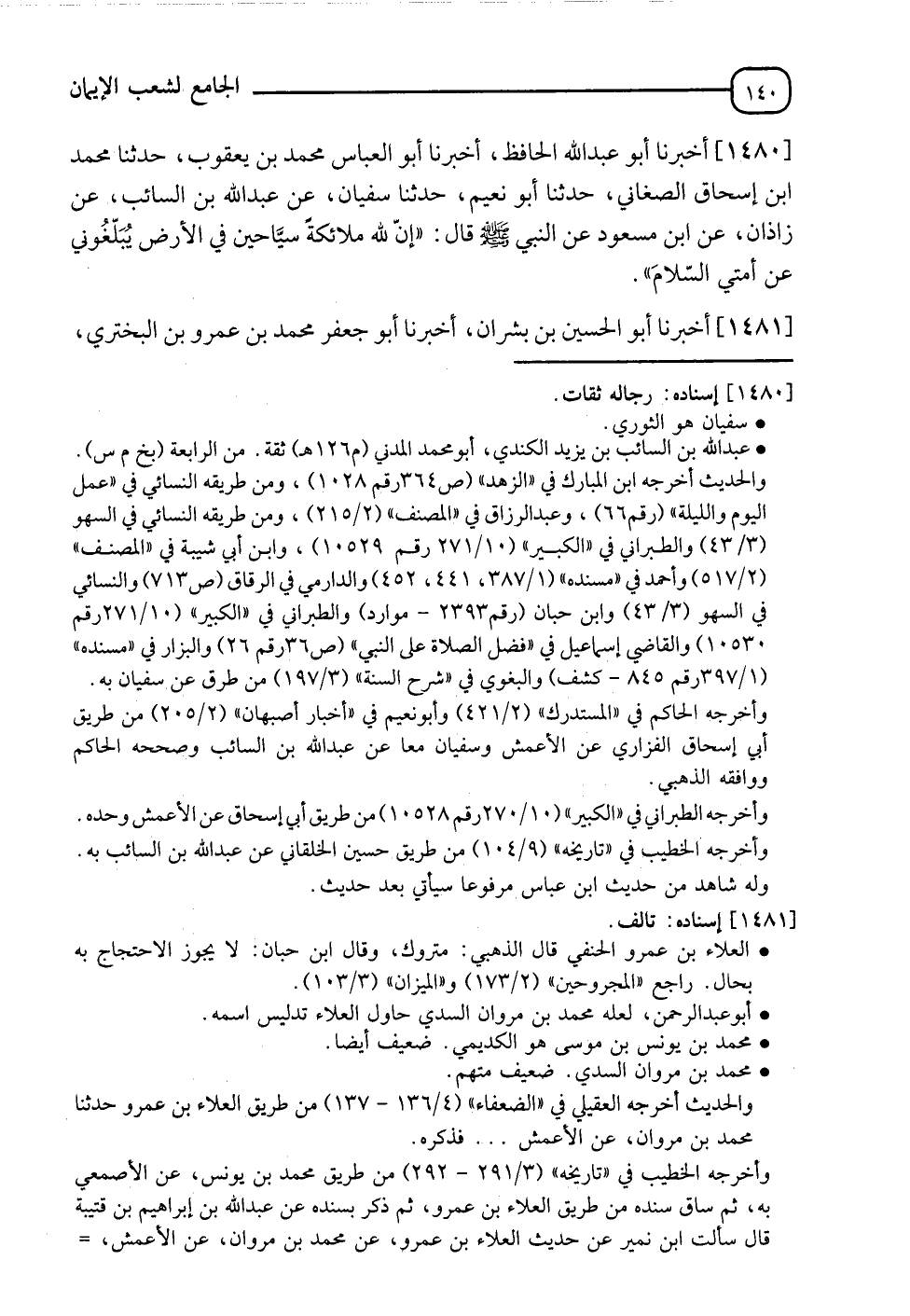 1480 - أَخْبَرَنَا أَبُو عَبْدِ اللهِ الْحَافِظُ، أخبرنا أَبُو الْعَبَّاسِ مُحَمَّدُ بْنُ يَعْقُوبَ، حدثنا مُحَمَّدُ بْنُ إِسْحَاقَ الصَّغَانِيُّ، حدثنا أَبُو نُعَيْمٍ، حدثنا سفيان، عَنْ عَبْدِ اللهِ بْنِ السَّائِبِ، عَنْ زَاذَانَ، عَنِ ابْنِ مَسْعُودٍ، عَنِ النَّبِيِّ صَلَّى اللَّهُ عَلَيْهِ وَسَلَّمَ قَالَ: " إِنَّ §لِلَّهِ مَلَائِكَةً سَيَّاحِينَ فِي الْأَرْضِ، يُبَلِّغُونِي عَنْ أُمَّتِي السَّلَامَ "