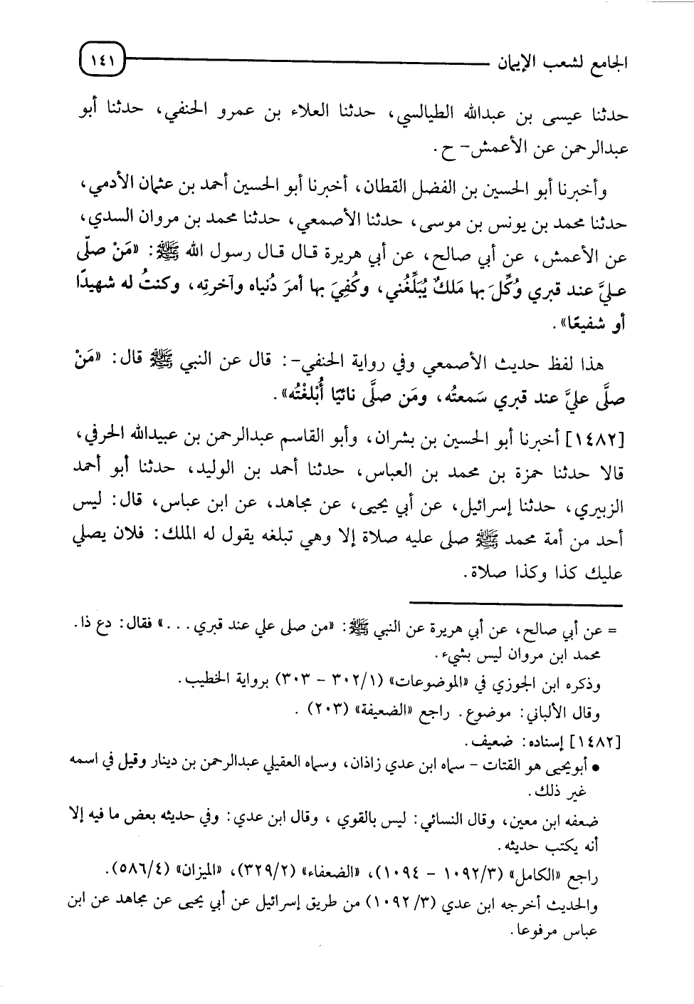 1482 - أَخْبَرَنَا أَبُو الْحُسَيْنِ بْنُ بِشْرَانَ، وَأَبُو الْقَاسِمِ عَبْدُ الرَّحْمَنِ بْنُ عُبَيْدِ اللهِ الْحَرْفِيُّ، قَالَا: حدثنا حَمْزَةُ بْنُ مُحَمَّدِ بْنِ الْعَبَّاسِ، حدثنا أَحْمَدُ بْنُ الْوَلِيدِ، حدثنا أَبُو أَحْمَدَ الزُّبَيْرِيُّ، حدثنا إِسْرَائِيلُ، عَنْ أَبِي يَحْيَى، عَنْ مُجَاهِدِ، عَنِ ابْنِ عَبَّاسٍ، قَالَ: §" لَيْسَ أَحَدٌ مِنْ أُمَّةِ مُحَمَّدٍ صَلَّى اللَّهُ عَلَيْهِ وَسَلَّمَ صَلَّى عَلَيْهِ صَلَاةً إِلَّا وَهِيَ تَبْلُغُهُ يَقُولُ له الْمَلَكُ: فُلَانٌ يُصَلِّي عَلَيْكَ كَذَا وَكَذَا صَلَاةً "