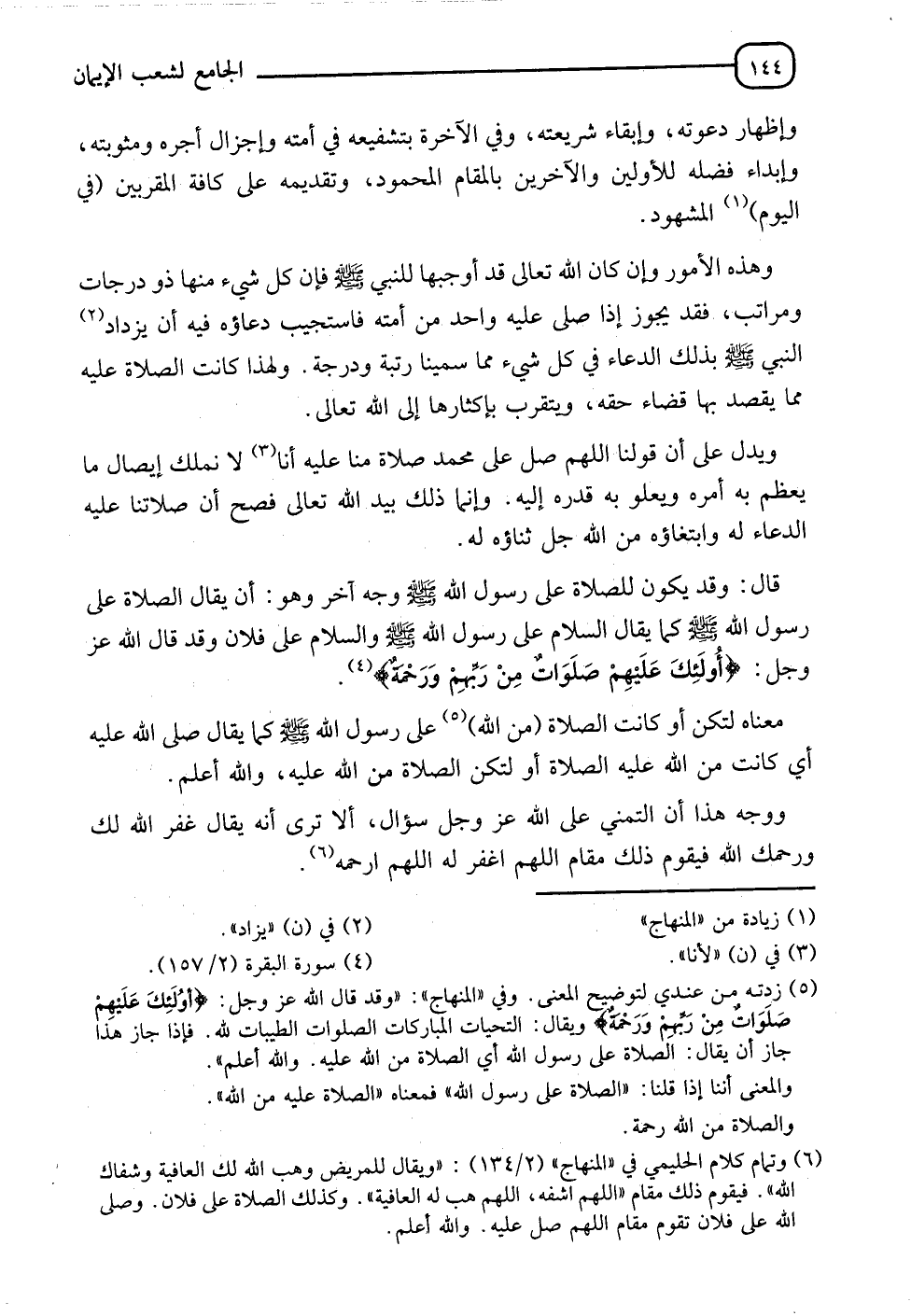 وَإِظْهَارِ دَعْوَتِهِ، وَإِبْقَاءِ شَرِيعَتِهِ وَفِي الْآخِرَةِ بِتَشْفِيعِهِ فِي أُمَّتِهِ، وَإِجْزَالِ أَجْرِهِ، وَمَثُوبَتِهِ، وَإِبْدَاءِ فَضْلِهِ لِلَأَوَّلِينَ وَالْآخِرِينَ بِالْمَقَامِ الْمَحْمُودِ، وَتَقْدِيمِهِ عَلَى كَافَّةِ الْمُقَرَّبِينَ فِي الْيَوْمِ الْمَشْهُودِ، وَهَذِهِ الْأُمُورُ وَإِنْ كَانَ اللهُ تَعَالَى قَدْ أَوْجَبَهَا لِلنَّبِيِّ صَلَّى اللَّهُ عَلَيْهِ وَسَلَّمَ، فإنَ كُلُّ شَيْءٍ مِنْهَا ذَو دَرَجَاتٍ وَمَرَاتِبَ، فَقَدْ يَجُوزُ إِذَا صَلَّى عَلَيْهِ وَاحِدٌ مِنْ أُمَّتِهِ فَاسْتُجِيبَ دُعَاءهُ فِيهِ أَنْ يَزْدَادَ النَّبِيُّ صَلَّى اللَّهُ عَلَيْهِ وَسَلَّمَ بِذَلِكَ الدُّعَاءِ فِي كُلِّ شَيْءٍ مِمَّا سَمَّيْنَا رُتْبَةً وَدَرَجَةً، وَلَهذا كَانَتِ الصَّلَاةُ عليه مِمَّا يُقْصَدُ بِهَا قَضَاءُ حَقِّهِ وَيُتْقَرَّبُ بِإِكْثَارِهَا إِلَى اللهِ تَعَالَى، وَيَدُلُّ عَلَى أَنَّ قَوْلَنَا: اللهُمَّ صَلِّ عَلَى مُحَمَّدٍ صَلَاةً مِنَّا عَلَيْهِ لِأَنَّا لَا نَمْلِكُ إِيصَالَ مَا يَعْظُمُ بِهِ أَمْرُهُ وَيَعْلُو بِهِ قَدْرَهُ إِلَيْهِ، وَإِنَّمَا ذَلِكَ بِيَدِ اللهِ تَعَالَى فَصَحَّ أَنَّ صَلَاتَنَا عَلَيْهِ الدُّعَاءُ لَهُ وَابْتِغَاءهُ مِنَ اللهِ جَلَّ ثناءه له قَالَ: وَقَدْ يَكُونُ لِلصَّلَاةِ عَلَى رَسُولِ اللهِ صَلَّى اللَّهُ عَلَيْهِ وَسَلَّمَ وَجْهٌ آخَرُ وَهُوَ أَنْ يُقَالَ: الصَّلَاةُ عَلَى رَسُولِ اللهِ صَلَّى اللَّهُ عَلَيْهِ وَسَلَّمَ كَمَا يُقَالُ السَّلَامُ عَلَى رَسُولِ اللهِ صَلَّى اللَّهُ عَلَيْهِ وَسَلَّمَ والسَّلَامُ عَلَى فُلَانٍ، وَقَدْ قَالَ اللهُ عَزَّ وَجَلَّ: {أُولَئِكَ عَلَيْهِمْ صَلَوَاتٌ مِنْ رَبِّهِمْ وَرَحْمَةٌ} [البقرة: 157]: مَعْنَاهُ لِتَكُنْ أَوْ كَانَتِ الصَّلَاةُ من الله عَلَى رَسُولِ اللهِ صَلَّى اللَّهُ عَلَيْهِ وَسَلَّمَ، كَمَا يُقَالُ صَلَّى اللَّهُ عَلَيْهِ وَسَلَّمَ أَيْ كَانَتْ مِنَ اللهِ عَلَيْهِ الصَّلَاةُ أَوْ لِتَكُنِ الصَّلَاةُ مِنَ اللهِ عَلَيْهِ - وَاللهُ أَعْلَمُ - وَوَجْهُ هَذَا أَنَّ التَّمَنِّي عَلَى اللهِ عَزَّ وَجَلَّ سُؤَالٌ أَلَا تَرَى أَنَّهُ يُقَالُ: غَفَرَ اللهُ لَكَ وَرَحِمَكَ اللهُ فَيَقُومُ ذَلِكَ مَقَامَ اللهُمَّ اغْفِرْ لَهُ، اللهُمَّ ارْحَمْهُ،