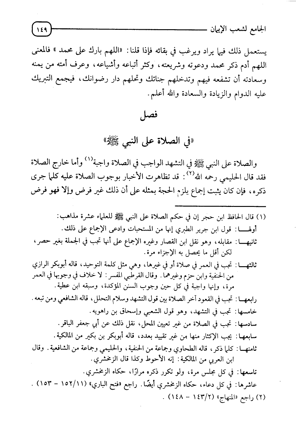 §فَصْلٌ فِي الصَّلَاةِ عَلَى النَّبِيِّ صَلَّى اللَّهُ عَلَيْهِ وَسَلَّمَ " وَالصَّلَاةُ عَلَى النَّبِيِّ صَلَّى اللَّهُ عَلَيْهِ وَسَلَّمَ فِي التَّشَهُّدِ الْوَاجِبِ فِي الصَّلَاةِ وَاجِبَةٌ " وَأَمَّا خَارِجَ الصَّلَاةِ فَقَدْ قَالَ الْحَلِيمِيُّ رَحِمَهُ اللهُ: " قَدْ تَظَاهَرَتِ الْأَخْبَارُ بِوُجُوبِ الصَّلَاةِ عَلَيْهِ كُلَّمَا جَرَى ذِكْرُهُ، فَإِنْ كَانَ يَثْبُتُ إِجْمَاعٌ يَلْزَمُ الْحُجَّةَ بِمِثْلِهِ عَلَى أَنَّ ذَلِكَ غَيْرُ فَرْضٍ، وَإِلَّا فَهُوَ فَرْضٌ