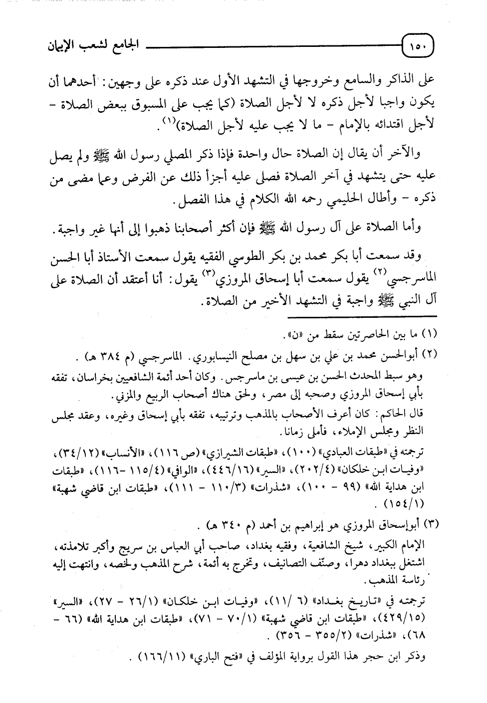 وَقَدْ سَمِعْتُ أَبَا بَكْرٍ مُحَمَّدَ بْنَ بَكْرٍ الطُّوسِيَّ الْفَقِيهَ يَقُولُ: سَمِعْتُ الأستاذ أَبَا الْحَسَنٍ الْمَاسَرْجُيَّ، يَقُولُ: سَمِعْتُ أَبَا إِسْحَاقَ الْمَرْوَزِيَّ يقول: " أَنَا أَعَتْقَدُ أَنَّ §الصَّلَاةَ عَلَى آلِ النَّبِيِّ صَلَّى اللَّهُ عَلَيْهِ وَسَلَّمَ وَاجِبَةٌ فِي التَّشَهُّدِ الْأَخِيرِ مِنَ الصَّلَاةِ "