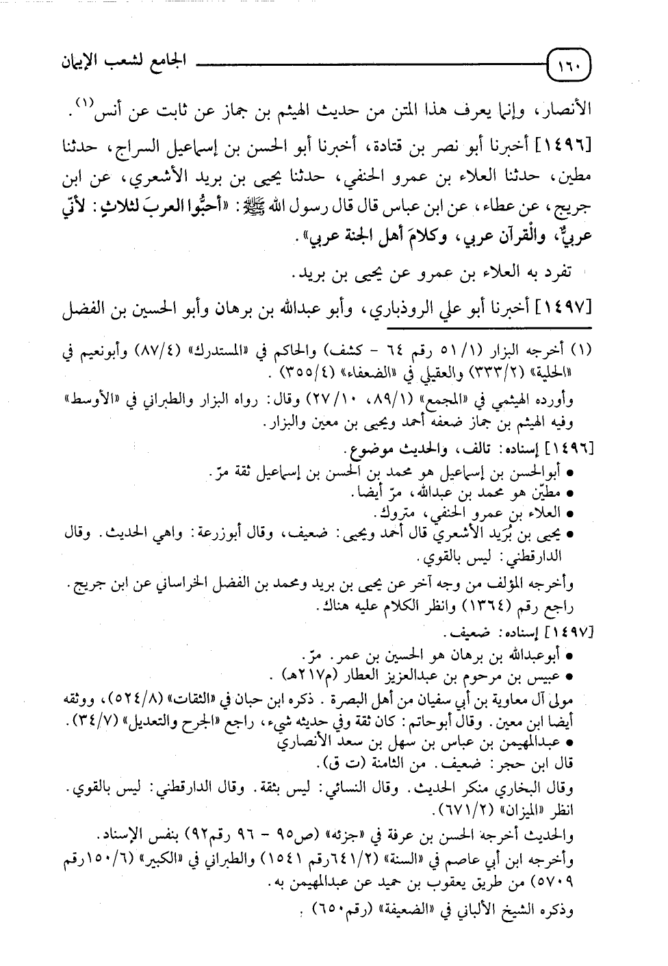 1496 - أخبرنا أَبُو نَصْرِ بْنُ قَتَادَةَ، أخبرنا أَبُو الْحَسَنِ بْنُ إِسْمَاعِيلَ السِّرَاجُ، حدثنا مُطَيَّنٌ، حدثنا الْعَلَاءُ بْنُ عَمْرٍو الْحَنَفِيُّ، حدثنا يَحْيَى بْنُ بُرَيْدٍ الْأَشْعَرِيُّ، عَنِ ابْنِ جُرَيْجٍ، عَنْ عَطَاءٍ، عَنِ ابْنِ عَبَّاسٍ، قَالَ: قَالَ رَسُولُ اللهِ صَلَّى اللَّهُ عَلَيْهِ وَسَلَّمَ: " §أَحِبُّوا الْعَرَبَ لِثَلَاثٍ: لِأَنِّي عَرَبِيٌّ، وَالْقُرْآنُ عَرَبِيٌّ، وَكَلَامُ أَهْلِ الْجَنَّةِ عَرَبِيٌّ " " تَفَرَّدَ بِهِ الْعَلَاءُ بْنُ عَمْرٍو، عَنْ يَحْيَى بْنِ يَزِيدَ "