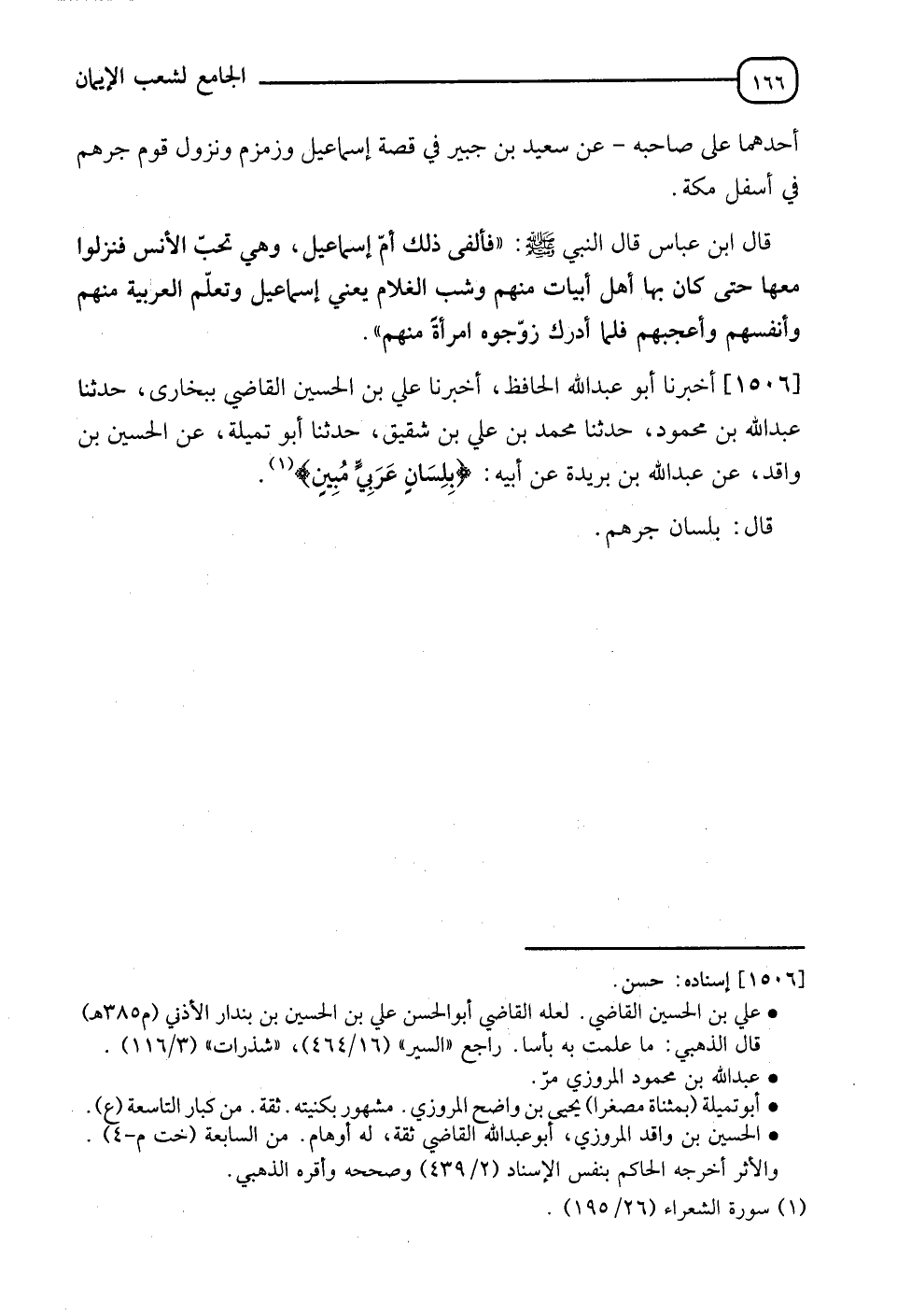 1506 - أَخْبَرَنَا أَبُو عَبْدِ اللهِ، أخبرنا عَلِيُّ بْنُ الْحُسَيْنِ الْقَاضِي بِبُخَارَى، حدثنا عَبْدُ اللهِ بْنُ مَحْمُودٍ، حدثنا مُحَمَّدُ بْنُ عَلِيِّ بْنِ شَقِيقٍ، حدثنا أَبُو تُمَيْلَةَ، عَنِ الْحُسَيْنِ بْنِ وَاقِدٍ، عَنْ عَبْدِ اللهِ بْنِ بُرَيْدَةَ، عَنْ أَبِيهِ، {§بلِسَانِ عَرَبِيٍّ مُبِينٍ} [الشعراء: 195] قَالَ: " بِلِسَانِ جُرْهُمٍ "