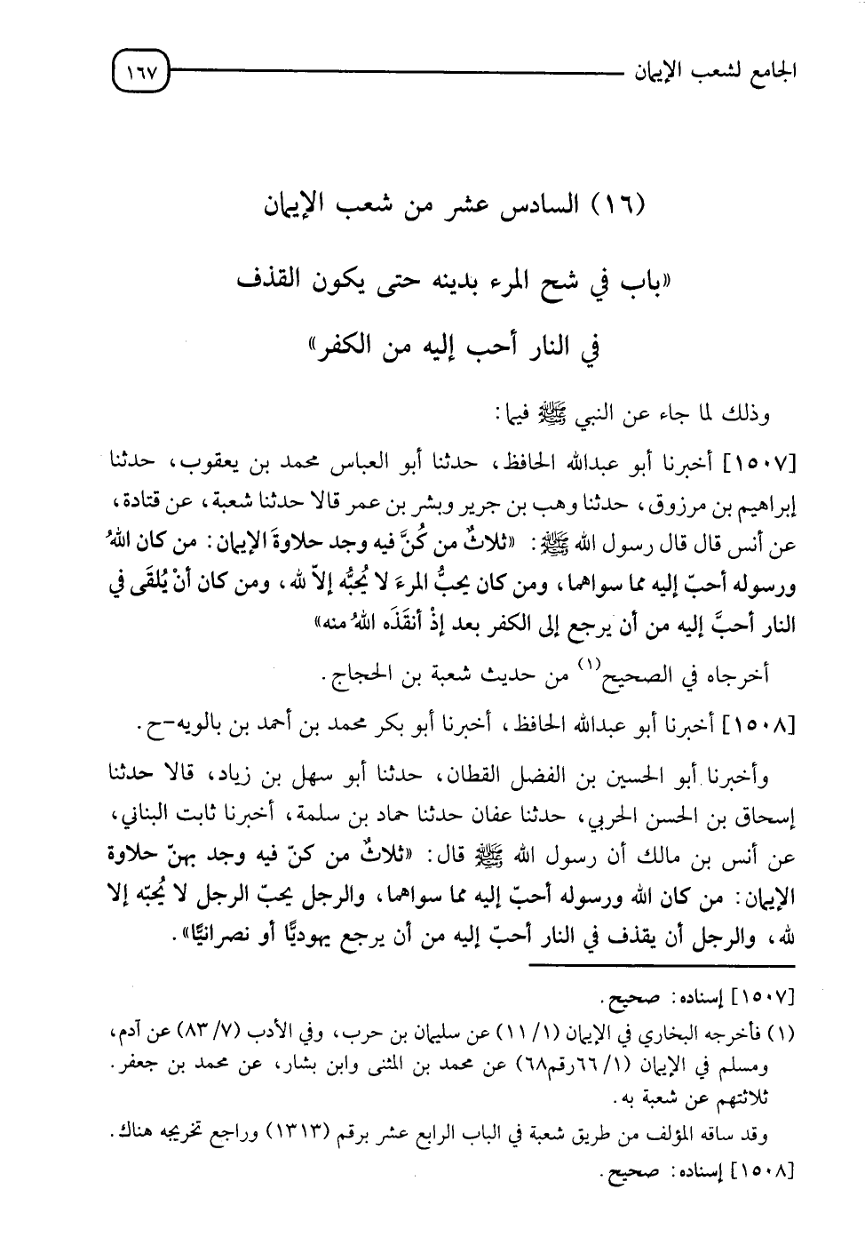 1507 - أَخْبَرَنَا أَبُو عَبْدِ اللهِ الْحَافِظُ، حدثنا أَبُو الْعَبَّاسِ مُحَمَّدُ بْنُ يَعْقُوبَ، حدثنا إِبْرَاهِيمُ بْنُ مَرْزُوقٍ، حدثنا وَهْبُ بْنُ جَرِيرٍ، وَبِشْرُ بْنُ عُمَرَ، قَالَا: حدثنا شُعْبَةُ، عَنْ قَتَادَةَ، عَنْ أَنَسٍ، قَالَ: قَالَ رَسُولُ اللهِ صَلَّى اللَّهُ عَلَيْهِ وَسَلَّمَ: " §ثَلَاثٌ مَنْ كُنَّ فِيهِ وَجَدَ حَلَاوَةَ الْإِيمَانِ: مَنْ كَانَ اللهُ وَرَسُولُهُ أَحَبَّ إِلَيْهِ مِمَّا سِوَاهُمَا، وَمَنْ كَانَ يُحِبُّ الْمَرْءَ لَا يُحِبُّهُ إِلَّا لِلَّهِ، وَمَنْ كَانَ أَنْ يُلْقَى فِي النَّارِ أَحَبَّ إِلَيْهِ مِنْ أَنْ يَرْجِعَ إِلَى الْكُفْرِ بَعْدَ إِذْ أَنْقَذَهُ اللهُ مِنْهُ " أَخْرَجَاهُ فِي الصَّحِيحِ مِنْ حَدِيثِ شُعْبَةَ بْنِ الْحَجَّاجِ