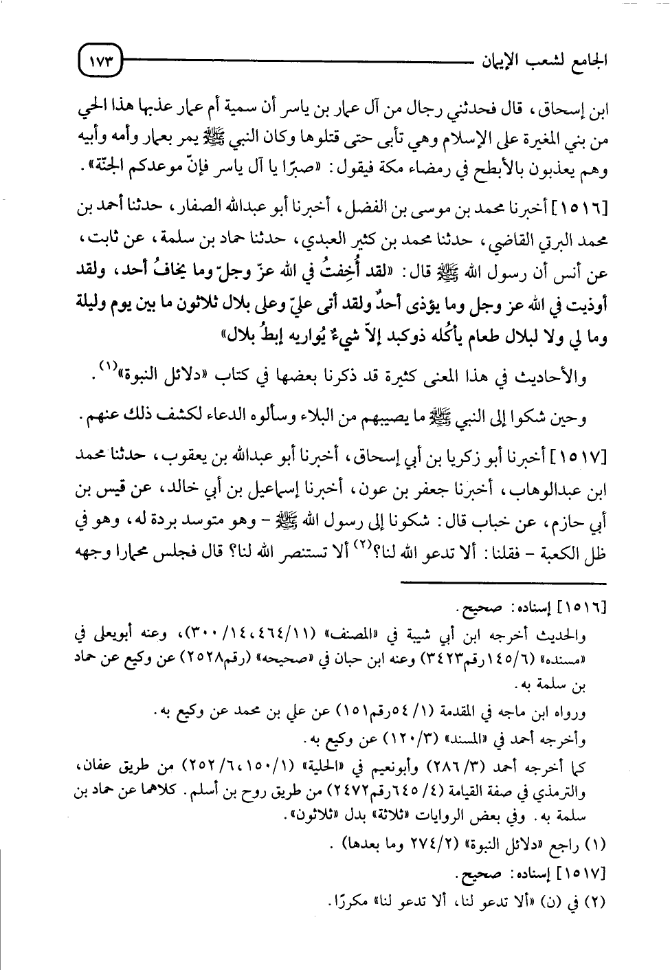 1517 - أَخْبَرَنَا أَبُو زَكَرِيَّا بْنُ أَبِي إِسْحَاقَ، أخبرنا أَبُو عَبْدِ اللهِ بْنُ يَعْقُوبَ، حدثنا مُحَمَّدُ بْنُ عَبْدِ الْوَهَّابِ، أخبرنا جَعْفَرُ بْنُ عَوْنٍ، أخبرنا إِسْمَاعِيلُ بْنُ أَبِي خَالِدٍ، عَنْ قَيْسِ بْنِ أَبِي حَازِمٍ، عَنْ خَبَّابٍ، قَالَ: شَكَوْنَا إِلَى رَسُولِ اللهِ صَلَّى اللَّهُ عَلَيْهِ وَسَلَّمَ، وَهُوَ مُتَوَسِّدٌ بِبُرْدَةٍ لَهُ، وَهُوَ فِي ظِلِّ الْكَعْبَةِ، فَقُلْنَا: أَلَا تَدْعُو اللهَ لَنَا أَلَا تَسْتَنْصِرُ اللهَ لَنَا؟ قَالَ: فَجَلَسَ مُحْمَارًّا وَجْهُهُ، -[174]- ثُمَّ قَالَ: " وَاللهِ، §إِنْ كَانَ مَنْ قَبْلَكُمْ لَيُؤْخَذُ الرَّجُلُ فَتُحْفَرُ لَهُ الْحُفْرَةُ فَيُوضَعُ الْمِنْشَارُ عَلَى رَأْسِهِ، فَيُشَقُّ باثْنَيْنِ مَا يَصْرِفُهُ عَنْ دِينِهِ، وَيُمْشَطُ بِأَمْشَاطِ الْحَدِيدِ مَا بَيْنَ عَصَبِهِ وَلَحْمِهِ مَا يَصْرِفُهُ ذَلِكَ عَنْ دِينِهِ، وَلَيُتِمَّنَّ اللهُ هَذَا الْأَمْرَ حَتَّى يَسِيرَ الرَّاكِبُ مِنْكُمْ مِنْ صَنْعَاءَ إِلَى حَضْرَمَوْتَ لَا يَخْشَى إِلَّا اللهَ عَزَّ وَجَلَّ أَوِ الذِّئْبَ عَلَى غَنَمِهِ، وَلَكِنَّكُمْ تَعْجَلُونَ " أَخْرَجَاهُ فِي الصَّحِيحِ مِنْ وَجْهٍ آخَرَ، عَنْ إِسْمَاعِيلَ