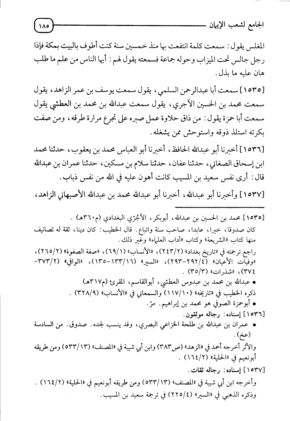 1535 - سَمِعْتُ أَبَا عَبْدِ الرَّحْمَنِ السُّلَمِيَّ يَقُولُ: سَمِعْتُ يُوسُفَ بْنَ عُمَرَ الزَّاهِدَ يَقُولُ: سَمِعْتُ مُحَمَّدَ بْنَ الحُسَيْنٍ الْآجُرِّيَّ يَقُولُ: سَمِعْتُ عَبْدَ اللهِ بْنَ مُحَمَّدٍ بن الْعْطَشِيَّ يَقُولُ: سَمِعْتُ أَبَا حَمْزَةَ يَقُولُ: " §مَنْ ذَاقَ حَلَاوَةَ عَمَلٍ صَبَّرَهُ عَلَى تَجَرُّعِ مَرَارَةِ طَرْقِهِ، وَمَنْ صفَتْ بكْرَتُهُ اسْتَلَذَّ ذَوْقَهُ وَاسْتَوْحَشَ مِمَّنْ يَشْغَلُهُ "