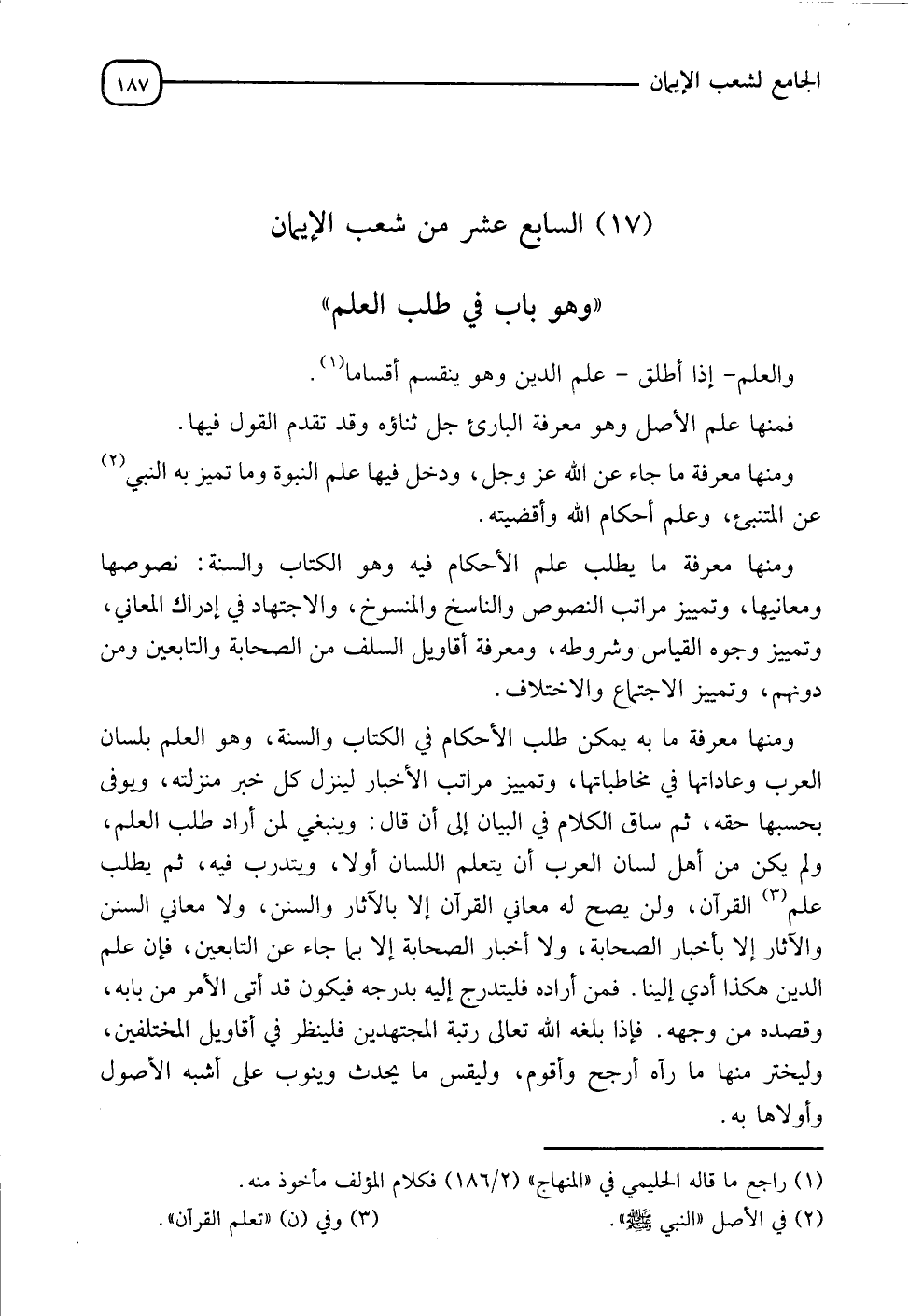 §السَّابِعَ عَشَرَ مِنْ شُعَبِ الْإِيمَانِ وَهُوَ بَابٌ فِي طَلَبِ الْعِلْمِ " وَالْعِلْمُ إِذَا أُطْلِقَ عِلْمُ الدِّينِ، وَهُوَ يَنْقَسِمُ أَقْسَامًا: فَمِنْهَا عِلْمُ الْأَصْلِ، وَهُوَ مَعْرِفَةُ الْبَارِئِ جَلَّ ثَنَاءهُ، وَقَدْ تَقَدَّمَ الْقَوْلُ فِيهَا، وَمِنْهَا مَعْرِفَةُ مَا جَاءَ عَنِ اللهِ عَزَّ وَجَلَّ، وَدَخَلَ فِيها عِلْمُ النُّبُوَّةِ، وَمَا تَمَيَّزَ بِهِ النَّبِيُّ عَنِ المتنبي، وَعِلْمُ أَحْكَامِ اللهِ وَأَقْضِتيهِ، وَمِنْهَا مَعْرِفَةُ مَا يُطْلَبُ عِلْمُ الْأَحْكَامِ فِيهِ وَهُوَ الْكِتَابُ وَالسُّنَّةُ نُصُوصُهَا وَمَعَانِيهَا، وَتَمْيِيزُ مَرَاتِبِ النُّصُوصِ، وَالنَّاسِخُ وَالْمَنْسُوخُ، وَالِاجْتِهَادُ فِي إِدْرَاكِ الْمَعَانِي وَتَمْيِيزُ وُجُوهِ الْقِيَاسِ وَشُرُوطِهِ، وَمَعْرِفَةُ أَقَاوِيلِ السَّلَفِ مِنَ الصَّحَابَةِ وَالتَّابِعِينَ وَمَنْ دُونَهُمْ، وَتَمْيِيزُ الِاجْتِمَاعِ وَالِاخْتِلَافِ وَمِنْهَا مَعْرِفَةُ مَا بِهِ يُمْكِنُ طَلَبُ الْأَحْكَامِ فِي الْكِتَابِ وَالسُّنَّةِ وَهُوَ الْعِلْمُ بِلِسَانِ الْعَرَبِ وَعَادَاتِهَا فِي مُخَاطَبَاتِهَا، وَتَمْيِيزُ مَرَاتِبِ الْأَخْبَارِ لَيُنْزَلَ كُلُّ خَبَرٍ مَنْزِلَتَهُ وَيُوَفَّى بِحَسْبِهَا حَقَّهُ، ثُمَّ سَاقَ الْكَلَامَ فِي الْبَيَانِ " إلى أن قَالَ: " وَيَنْبَغِي لِمَنْ أَرَادَ طَلَبَ الْعِلْمِ، وَلَمْ يَكُنْ مِنْ أَهْلِ لِسَانِ الْعَرَبِ أَنْ يَتَعَلَّمَ اللِّسَانَ أَوَلًا، وَيَتَدَرَّبَ فِيهِ ثُمَّ يَطْلُبُ عِلْمَ الْقُرْآنِ، ولَنْ يصِحَ لَهُ مَعَانِي الْقُرْآنِ إِلَّا بِالْآثَارِ وَالسُّنَنِ، وَلَا مَعَانِي السُّنَنِ وَالْآثَارِ إِلَّا بَأَخْبَارِ الصَّحَابَةِ، وَلَا أَخْبَارُ الصَّحَابَةِ إِلَّا بِمَا جَاءَ عَنِ التَّابِعِينَ، فَإِنَّ عِلْمَ الدِّينِ هَكَذَا أُدِّيَ إِلَيْنَا فَمَنْ أَرَادَهُ فَلْيَتَدَرَّجْ إِلَيْهِ بِدَرَجَه، فَيَكُونُ قَدْ أَتَى الْأَمْرَ مِنْ بَابِهِ، وَقَصَدَهُ مِنْ وَجْهِهِ، فَإِذَا بَلَّغَهُ اللهُ تعالى رتبةَ الْمُجْتَهِدِينَ فَلْيَنْظُرْ فِي أَقَاوِيلِ الْمُخْتَلِفِينَ، وَلْيَخْتَرْ مِنْهَا مَا رآهُ أَرْجَحَ وَأَقْوَمَ، وَلْيِقِسْ مَا يَحْدُثُ وَيَنُوبُ عَلَى أَشْبَهِ الْأُصُولِ وَأَوْلَاهَا بِهِ "