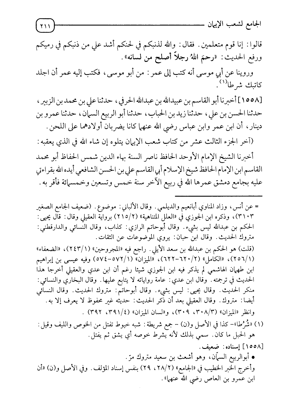 1558 - أَخْبَرَنَا أَبُو الْقَاسِمِ بْنُ عُبَيْدِ اللهِ بْنِ عَبْدِ اللهِ الْحَرْفِيُّ، حدثنا عَلِيُّ بْنُ مُحَمَّدِ بْنِ الزُّبَيْرِ، حدثنا الْحَسَنُ بْنُ عَلِيٍّ، حدثنا زَيْدُ بْنُ الْحُبَابِ، حدثنا أَبُو الرَّبِيعِ السَّمَّانُ، حدثنا عَمْرُو بْنُ دِينَارٍ " أَنَّ ابْنَ عُمَرَ، وَابْنَ عَبَّاسٍ رَضِيَ اللهُ عَنْهُمَا كَانَا §يَضْرِبَانِ أَوْلَادَهُمَا عَلَى اللَّحْنِ "