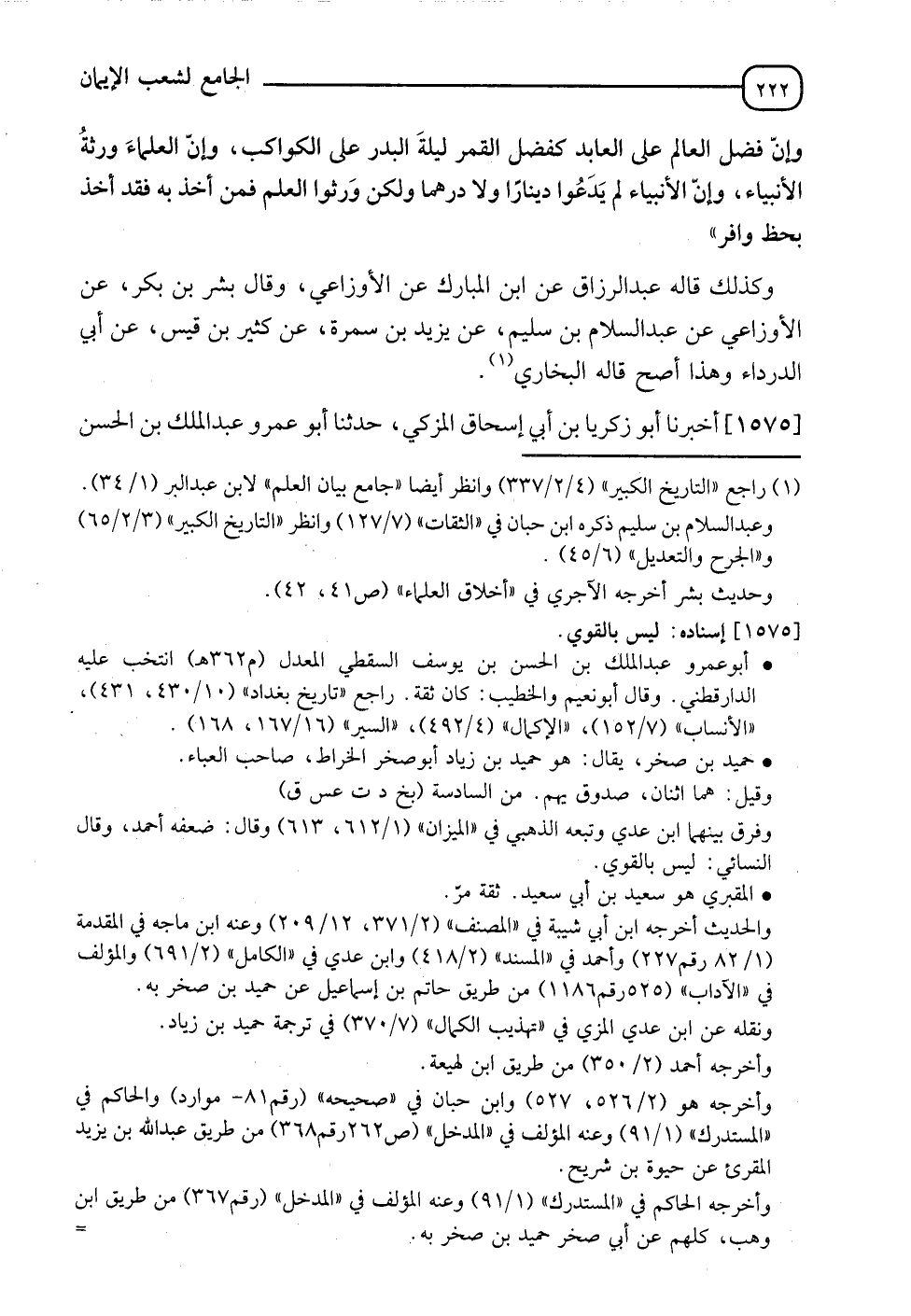 " وَإِنَّ §الْأَنْبِيَاءَ لَمْ يَدَعُوا دِينَارًا وَلَا دِرْهَمًا، وَلَكِنْ وَرَّثُوا الْعِلْمَ، فَمَنْ أَخَذَ بِهِ فَقَدْ أَخَذَ بِحَظٍّ وَافِرٍ " وكَذَلِكَ قَالَهُ: عَبْدُ الرَّزَّاقِ، عَنِ ابْنِ الْمُبَارَكِ، عَنِ الْأَوْزَاعِيِّ، وَقَالَ بِشْرُ بْنُ بَكْرٍ، عَنِ الْأَوْزَاعِيِّ، عَنْ عَبْدِ السَّلَامِ بْنِ سُلَيْمٍ، عَنْ يَزِيدَ بْنِ سَمُرَةَ، عَنْ كَثِيرِ بْنِ قَيْسٍ، عَنْ أَبِي الدَّرْدَاءِ وَهَذَا أَصَحُّ، قَالَهُ الْبُخَارِيُّ