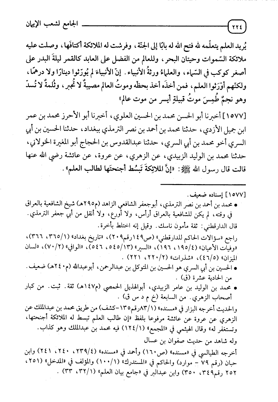 1577 - أَخْبَرَنَا أَبُو الْحَسَنِ مُحَمَّدُ بْنُ الْحُسَيْنِ الْعَلَوِيُّ، أخبرنا أَبُو الْأَحْرَزِ مُحَمَّدُ بْنُ عُمَرَ بْنِ جَمِيلٍ الْأَزْدِيُّ، حدثنا مُحَمَّدُ بْنُ أَحْمَدَ بْنِ نَصْرٍ التِّرْمِذِيُّ بِبَغْدَادَ، حدثنا الْحُسَيْنُ بْنُ أَبِي السَّرِيِّ أَخُو مُحَمَّدِ بْنِ أَبِي السَّرِيِّ، حدثنا عَبْدُ الْقُدُّوسِ بْنُ الْحَجَّاجِ أَبُو الْمُغِيرَةِ الْخَوْلَانِيُّ، حدثنا مُحَمَّدُ بْنُ الْوَلِيدِ الزُّبَيْدِيُّ، عَنِ الزُّهْرِيِّ، عَنْ عُرْوَةَ، عَنْ عَائِشَةَ رَضِيَ اللهُ عَنْهَا، قَالَتْ: قَالَ رَسُولُ اللهِ صَلَّى اللَّهُ عَلَيْهِ وَسَلَّمَ: " إِنَّ §الْمَلَائِكَةَ تَبْسُطُ أَجْنِحَتَهَا لِطَالِبِ الْعِلْمِ "