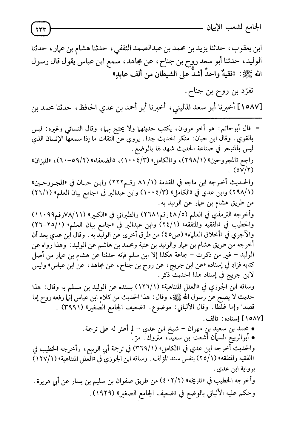 1587 - أَخْبَرَنَا أَبُو سَعْدٍ الْمَالِينِيُّ، أخبرنا أَبُو أَحْمَدَ بْنُ عَدِيٍّ الْحَافِظُ، حدثنا مُحَمَّدُ بْنُ -[234]- سَعِيدِ بْنِ مِهْرَانَ، حدثنا شَيْبَانُ، حدثنا أَبُو الرَّبِيعِ السَّمَّانُ، عَنْ أَبِي الزِّنَادِ، عَنِ الْأَعْرَجِ، عَنْ أَبِي هُرَيْرَةَ، قَالَ: قَالَ رَسُولُ اللهِ صَلَّى اللَّهُ عَلَيْهِ وَسَلَّمَ: " §لِكُلِّ شَيْءٍ دِعَامَةٌ، وَدِعَامَةُ الْإِسْلَامِ الْفِقْهُ فِي الدِّينِ، وَلَفَقِيهٌ أَشَدُّ عَلَى الشَّيْطَانِ مِنْ أَلْفِ عَابِدٍ " " تَفَرَّدَ بِهِ أَبُو الرَّبِيعِ، عَنْ أَبِي الزِّنَادِ "
