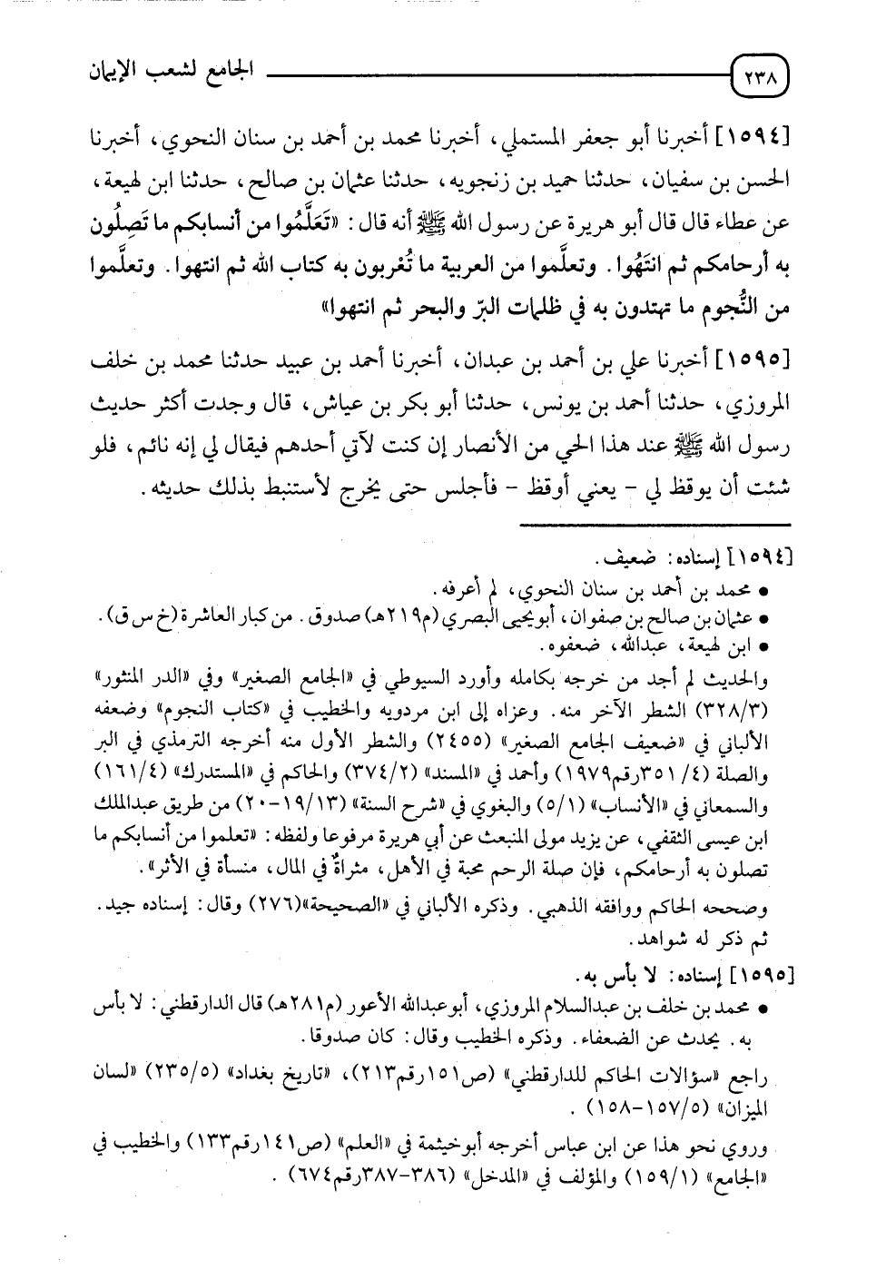 1594 - أَخْبَرَنَا أَبُو جَعْفَرٍ الْمُسْتَمْلي، أَخْبَرَنَا مُحَمَّدُ بْنُ أَحْمَدَ بْنِ سِنَانٍ النَّحْوِيُّ، أَخْبَرَنَا الْحَسَنُ بْنُ سُفْيَانَ، حدثنا حُمَيْدُ بْنُ زَنْجَوَيْهِ، حدثنا عُثْمَانُ بْنُ صَالِحٍ، حدثنا ابْنُ لَهِيعَةَ، عَنْ عَطَاءٍ، قَالَ: قَالَ أَبُو هُرَيْرَةَ، عَنْ رَسُولِ اللهِ صَلَّى اللَّهُ عَلَيْهِ وَسَلَّمَ أَنَّهُ قَالَ: §" تَعلَّمُوا مِنْ أنسابكُمْ مَا تَصِلُونَ بِهِ أَرْحَامَكُمْ ثُمَّ انْتَهُوا - وَتَعَلَّمُوا مِنَ الْعَرَبِيَّةِ مَا تُعْرِبُونَ بِهِ كِتَابَ اللهِ ثُمَّ انْتَهُوا - وَتَعَلَّمُوا مِنَ النُّجُومِ مَا تَهْتَدُونَ بِهِ فِي ظُلُمَاتِ الْبِرِّ وَالْبَحْرِ ثُمَّ انْتَهُوا "