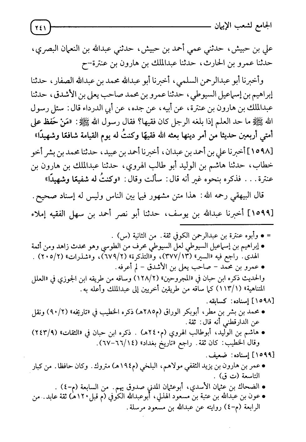 1599 - أَخْبَرَنَا عَبْدُ اللهِ بْنُ يُوسُفَ، حدثنا أَبُو نَصْرٍ أَحْمَدُ بْنُ سَهْلٍ الْفَقِيهُ إِمْلَاءً -[242]- بِبُخَارَى، حدثنا جَعْفَرُ بْنُ شُعَيْبٍ الشَّاشِيُّ، حدثنا أَبُو طَالِبٍ الْهَرَوِيُّ، حدثنا عُمَرُ بْنُ هَارُونَ عَنِ الضَّحَّاكِ بْنِ عُثْمَانَ الْأَسَدِيِّ، عَنْ عَوْنِ بْنِ عَبْدِ اللهِ، عَنْ عُتبَةَ، قَالَ: قَالَ عَبْدُ اللهِ بْنُ مَسْعُودٍ: " إِنَّ §هُدَى النَّاسِ فِي عَالِمٍ: جِيرَانُهُ وَأَهْلُ بَيْتِهِ، وَإِنَّمَا مَثَلُ الْعَالِمِ بَيْنَ جِيرَانِهِ وَأَهْلِ بَيْتِهِ كَمَثَلِ بِئْرٍ بَيْنَ أَظْهُرِهِمْ إِذَا احْتَاجُوا إِلَى مَائهَا اسْتَقَوْا مِنْهَا، فَبَيْنَمَا هُمْ كَذَلِكَ إِذْ أَصْبَحُوا وَقَدْ غَارَ مَاؤُهَا "