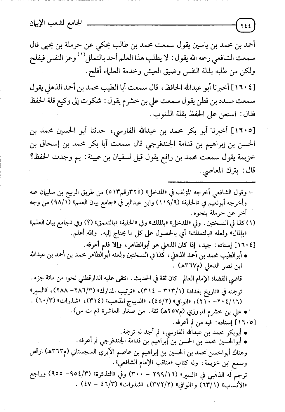 1605 - أَخْبَرَنَا أَبُو بَكْرٍ مُحَمَّدُ بْنُ عَبْدِ اللهِ الْفَارِسِيُّ، حدثنا أَبُو الْحُسَيْنِ مُحَمَّدُ بْنُ الْحَسَنِ بْنِ إِبْرَاهِيمَ بْنِ قُدَامَةَ الْجُنْدَفرْجِيُّ، قَالَ: سَمِعْتُ أَبَا بَكْرٍ مُحَمَّدَ بْنَ إِسْحَاقَ بْنِ خُزَيْمَةَ، يَقُولُ: سَمِعْتُ مُحَمَّدَ بْنَ رَافِعٍ، يَقُولُ: قِيلَ لِسُفْيَانَ بْنِ عُيَيْنَةَ: §بِمَ وَجَدْتَ الْحِفْظَ؟ قَالَ: " بِتَرْكِ الْمَعَاصِي "