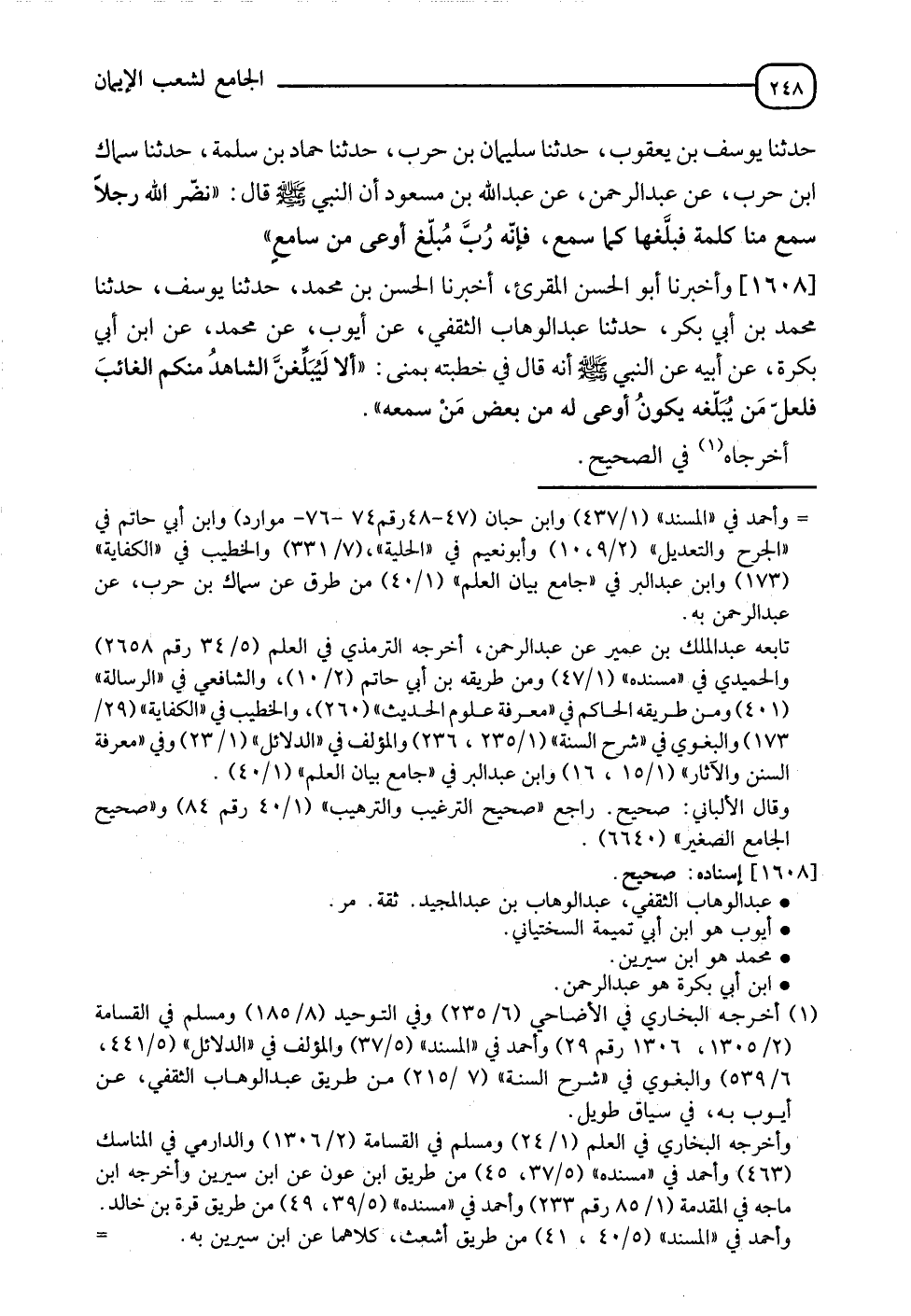 1608 - وَأَخْبَرَنَا أَبُو الْحَسَنِ الْمُقْرِئُ، أخبرنا الْحَسَنُ بْنُ مُحَمَّدٍ، حدثنا يُوسُفُ، حدثنا مُحَمَّدُ بْنُ أَبِي بَكْرٍ، حدثنا عَبْدُ الْوَهَّابِ الثَّقَفِيُّ، عَنْ أَيُّوبَ، عَنْ مُحَمَّدِ عنِ ابْنِ أَبِي بَكْرَةَ، عَنْ أَبِيهِ، عَنِ النَّبِيِّ صَلَّى اللَّهُ عَلَيْهِ وَسَلَّمَ أَنَّهُ قَالَ فِي خُطْبَتِهِ بِمِنًى: " §أَلَا لِيُبَلِّغَنَّ الشَّاهِدُ مِنْكُمُ الْغَائِبَ، فَلَعَلَّ مَنْ يُبَلَّغُهُ يَكُونُ أَوْعَى لَهُ مِنْ بَعْضِ مَنْ سَمِعَهُ " أَخْرَجَاهُ فِي الصَّحِيحِ