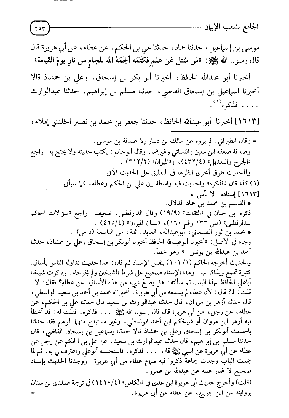 1613 - أَخْبَرَنَا أَبُو عَبْدِ اللهِ الْحَافِظُ، حَدَّثَنَا جَعْفَرُ بْنُ مُحَمَّدِ بْنِ نُصَيْرٍ الْخَلَدِيُّ إِمْلَاءً، -[254]- حَدَّثَنَا الْقَاسِمُ بْنُ مُحَمَّدِ بْنِ حَمَّادٍ حَدَّثَنَا أَحْمَدُ بْنُ عَبْدِ اللهِ بْنِ يُونُسَ، حَدَّثَنِي مُحَمَّدُ بْنُ -[255]- ثَوْرٍ، حدثنا ابْنُ جُرَيْجٍ، قَالَ: جَاءَ الْأَعْمَشُ إِلَى عَطَاءٍ فَسَأَلَهُ عَنْ حَدِيثِهِ فَحَدَّثَهُ، فَقُلْنَا لَهُ: تخبر هَذَا وَهُوَ عِرَاقِيٌّ؟ قَالَ: لِأَنِّي سَمِعْتُ أَبَا هُرَيْرَةَ يُحَدِّثُ، عَنِ النَّبِيِّ صَلَّى اللَّهُ عَلَيْهِ وَسَلَّمَ أَنَّهُ قَالَ: §" مَنْ سُئِلَ عَنْ عِلْمٍ فَكَتَمَهُ جِيءَ بِهِ يَوْمَ الْقِيَامَةِ وَقَدْ أُلْجِمَ بِلِجَامٍ مِنْ نَارٍ " وَرُوِّينَا مِنْ حَدِيثِ إِبْرَاهِيمَ بْنِ طَهْمَانَ، عَنْ سِمَاكٍ، عَنْ عَطَاءِ بْنِ أَبِي رَبَاحٍ كَذَلِكَ مَرْفُوعًا، وَرَوَاهُ قَتَادَةُ عَنْ عَطَاءٍ، عَنْ أَبِي هُرَيْرَةَ، مَوْقُوفًا، -[256]- وَرُوِّينَا عَنْ عَبْدِ اللهِ بْنِ عَمْرٍو عَنِ النَّبِيِّ صَلَّى اللَّهُ عَلَيْهِ وَسَلَّمَ " وَكُلُّ ذَلِكَ مَذْكُورٌ فِي كِتَابِ الْمَدْخَلِ "