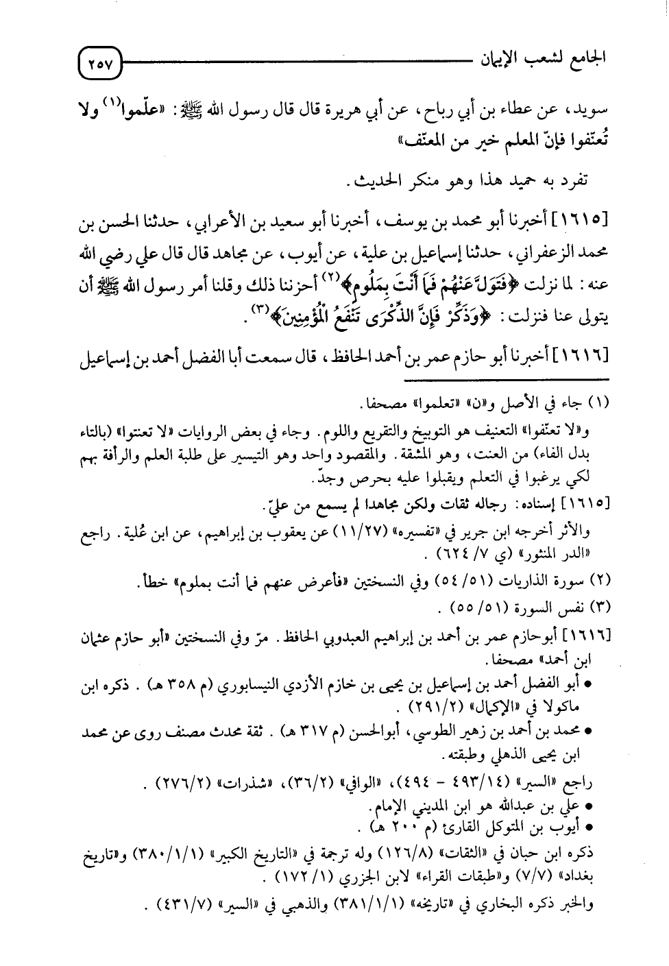 1615 - أَخْبَرَنَا أَبُو مُحَمَّدِ بْنُ يُوسُفَ، أخبرنا أَبُو سَعِيدِ بْنُ الْأَعْرَابِيِّ، حدثنا الْحَسَنُ بْنُ مُحَمَّدٍ الزَّعْفَرَانِيُّ، حدثنا إِسْمَاعِيلُ ابْنُ عُلَيَّةَ، عَنْ أَيُّوبَ، عَنْ مُجَاهِدٍ، قَالَ: قَالَ عَلِيٌّ رَضِيَ اللهُ عَنْهُ: " §لَمَّا نَزَلَتْ: {فَتَوَلَّ عَنْهُمْ فَمَا أَنْتَ بِمَلُومٍ} [الذاريات: 54] أَحْزَنَنَا ذَلِكَ، وَقُلْنَا: أُمِرَ رَسُولُ اللهِ صَلَّى اللَّهُ عَلَيْهِ وَسَلَّمَ أَنْ يَتَوَلَّى عَنَّا " فَنَزَلَتْ: {وَذَكِّرْ فَإِنَّ الذِّكْرَى تَنْفَعُ الْمُؤْمِنِينَ} [الذاريات: 55]