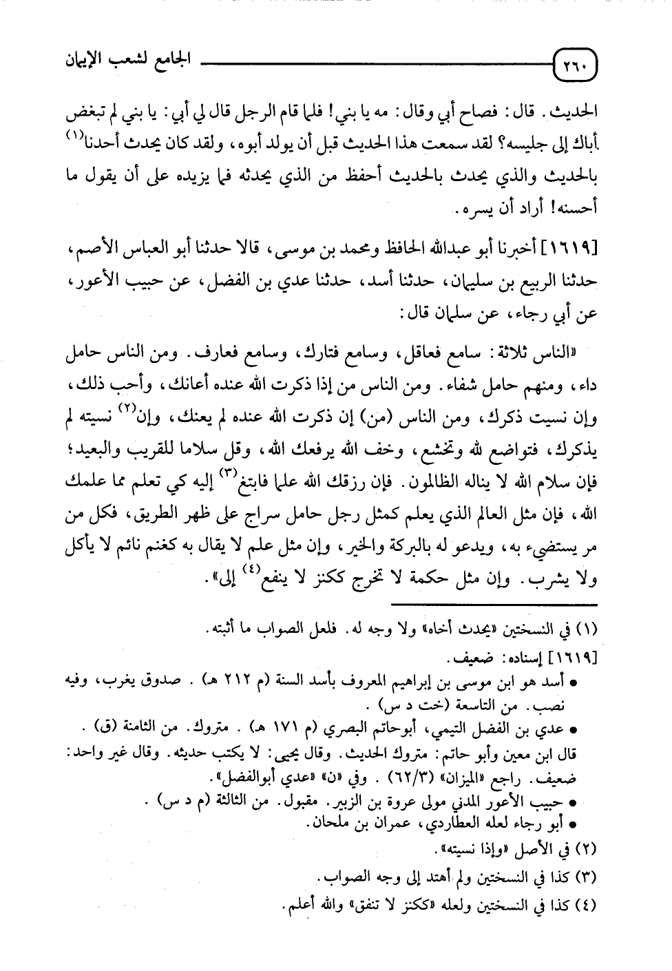 1619 - أَخْبَرَنَا أَبُو عَبْدِ اللهِ الْحَافِظُ، وَمُحَمَّدُ بْنُ مُوسَى، قَالَا: حدثنا أَبُو الْعَبَّاسِ الْأَصَمُّ، حدثنا الرَّبِيعُ بْنُ سُلَيْمَانَ، حدثنا أَسَدٌ، حدثنا عَدِيُّ بْنُ الْفَضْلِ، عَنْ حَبِيبٍ الْأَعْوَرِ، عَنْ أَبِي رَجَاءٍ، عَنْ سْلْمَانَ، قَالَ: " §النَّاسُ ثَلَاثَةٌ: سَامِعٌ فَعَاقِلٌ، وَسَامِعٌ فَتَارِكٌ، وَسَامِعٌ فَعَارِفٌ، وَمِنَ النَّاسِ حَامِلُ دَاءٍ، وَمِنْهُمْ حَامِلُ شِفَاءٍ، وَمِنَ النَّاسِ مَنْ إِذَا ذَكَرْتَ اللهَ عِنْدَهُ أَعَانَكَ وَأَحَبَّ ذلَكَ، وَإِنْ نَسِيتَ ذَكَّرَكَ، وَمِنَ النَّاسِ من إِنْ ذَكَرْتَ اللهَ عِنْدَهُ لَمْ يُعِنْكَ، وَإِن نَسِيتَه لَمْ يُذَكِّرْكَ، فَتَوَاضَعْ لِلَّهِ وَتَخَشَّعْ، وَخَفِ اللهَ يَرْفَعْكَ اللهُ، وَقُلْ سَلَامًا لِلْقَرِيبِ وَالْبَعِيدِ، فَإِنَّ سَلَامَ اللهِ لَا يَنَالُهُ الظَّالِمُونَ، فَإِنْ رَزَقَكَ اللهُ عِلْمًا فَابْتَغِ إِلَيْهِ كَيْ تُعَلِّمَ مِمَّا عَلَّمَكَ اللهُ، فَإِنَّ مَثَلَ الْعَالِمِ الَّذِي يُعَلِّمُ كَمَثَلِ رَجُلٍ حَامِلِ سِرَاجٍ عَلَى ظَهْرِ الطَّرِيقِ، فَكُلُّ مَنْ مَرَّ يَسْتَضِيءُ بِهِ، وَيَدْعُو لَهُ بِالْبَرَكَةِ وَالْخَيْرِ، وَإِنَّ مَثَلَ عِلْمٍ لَا يُقَالُ بِهِ كَغَنَمٍ نَائِمٍ لَا يَأْكُلُ وَلَا يَشْرَبُ، وَإِنَّ مَثَلَ حِكْمَةٍ لَا تَخْرُجُ كَكَنْزٍ لَا يُنْفَعُ إلى "
