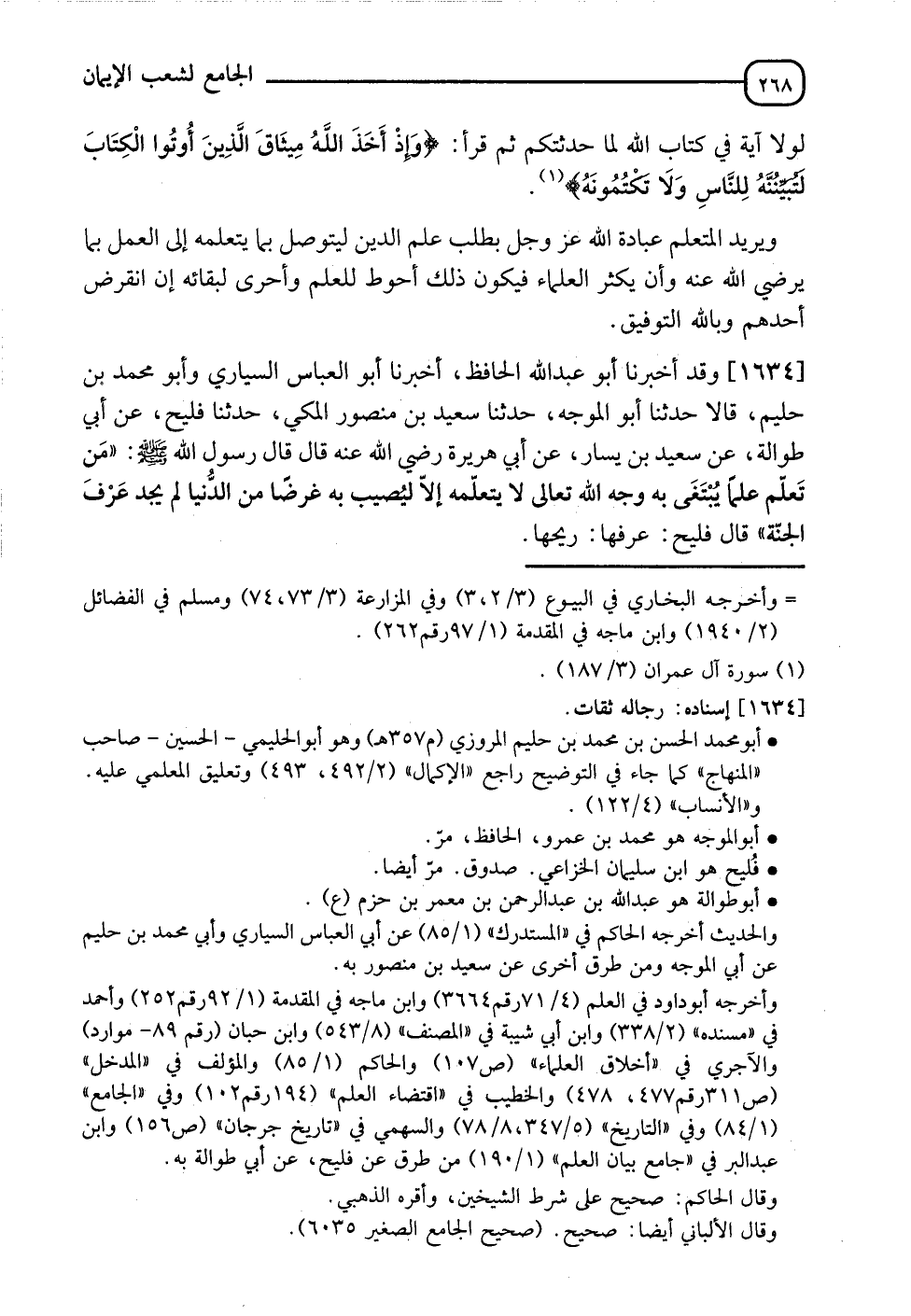 لَوْلَا آيَةٌ فِي كِتَابِ اللهِ لَمَا حَدَّثْتُكُمْ " ثُمَّ قَرَأَ: {وَإِذْ أَخَذَ اللهُ مِيثَاقَ الَّذِينَ أُوتُوا الْكِتَابَ لَتُبَيِّنُنَّهُ لِلنَّاسِ وَلَا تَكْتُمُونَهُ} [آل عمران: 187] وَيُرِيدُ الْمُتَعَلِّمُ عِبَادَةَ اللهِ عَزَّ وَجَلَّ، فَطَلَبَ عِلْمَ الدِّينِ لِيَصِلَ بِمَا يَتَعَلَّمُهُ إِلَى الْعَمَلِ بِمَا يُرْضِي اللهَ عَنْهُ، وَأَنْ يَكْثُرَ الْعُلَمَاءُ، فَيَكُونُ ذَلِكَ أَحْوَطَ لِلْعِلْمِ، وَأَحْرَى لِبَقَائِهِ إِنِ انْقَرَضَ أَحَدُهُمْ، وَبِاللهِ التَّوْفِيقُ "