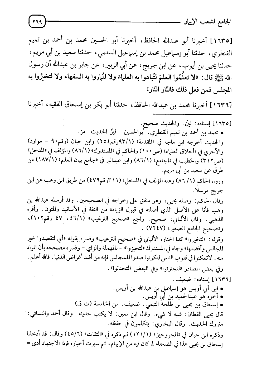 1635 - أَخْبَرَنَا أَبُو عَبْدِ اللهِ الْحَافِظُ، أخبرنا أَبُو الْحُسَيْنِ مُحَمَّدُ بْنُ أَحْمَدَ بْنِ تَمِيمٍ الْقَنْطَرِيُّ، حدثنا أَبُو إِسْمَاعِيلَ مُحَمَّدُ بْنُ إِسْمَاعِيلَ السُّلَمِيُّ، حدثنا سَعِيدُ بْنُ أَبِي مَرْيَمَ، حدثنا يَحْيَى بْنُ أَيُّوبَ، عَنِ ابْنِ جُرَيْجٍ، عَنْ أَبِي الزُّبَيْرِ، عَنْ جَابِرِ بْنِ عَبْدِ اللهِ أَنَّ رَسُولَ اللهِ صَلَّى اللَّهُ عَلَيْهِ وَسَلَّمَ قَالَ:" §لَا تَعَلَّمُوا الْعِلْمَ لِتُبَاهُوا بِهِ الْعُلَمَاءَ، وَلَا لِتُمَارُوا بِهِ السُّفَهَاءَ، وَلَا لِتخيرُوا بِهِ الْمَجْلِسَ، فَمَنْ فَعَلَ ذَلِكَ فَالنَّارَ النَّارَ"