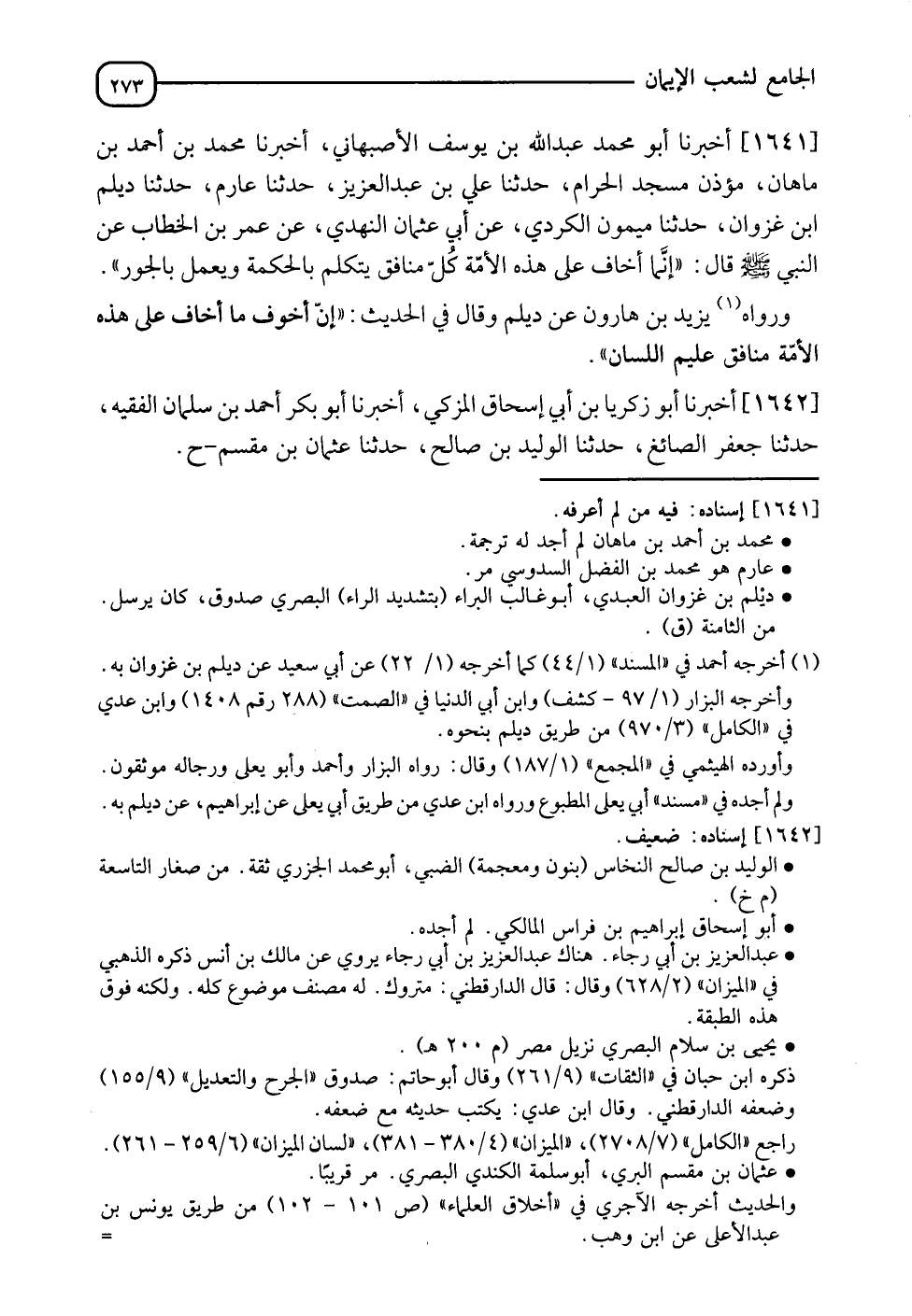 1641 - أَخْبَرَنَا أَبُو مُحَمَّدٍ عَبْدُ اللهِ بْنُ يُوسُفَ الْأَصْبَهَانِيُّ، أخبرنا مُحَمَّدُ بْنُ أَحْمَدَ بْنِ مَاهَانَ مُؤَذِّنُ الْمَسْجِدِ الْحَرَامِ، حدثنا عَلِيُّ بْنُ عَبْدِ الْعَزِيزِ، حدثنا عَارِمٌ، حدثنا دَيْلَمُ بْنُ غَزْوَانَ، حدثنا مَيْمُونٌ الْكُرْدِيُّ، عَنْ أَبِي عُثْمَانَ النَّهْدِيِّ، عَنْ عُمَرَ بْنِ الْخَطَّابِ، عَنِ النَّبِيِّ صَلَّى اللَّهُ عَلَيْهِ وَسَلَّمَ قَالَ: " إِنَّمَا §أَخَافُ عَلَى هَذِهِ الْأُمَّةِ كُلَّ مُنَافِقٍ يَتَكَلَّمُ بِالْحِكْمَةِ، وَيَعْمَلُ بِالْجَوْرِ " وَرَوَاهُ يَزِيدُ بْنُ هَارُونَ، عَنْ دَيْلَمٍ، وَقَالَ فِي الْحَدِيثِ: " إِنَّ أَخْوَفَ مَا أَخَافُ عَلَى هَذِهِ الْأُمَّةِ مُنَافِقٌ عَلِيمُ اللِّسَانِ "