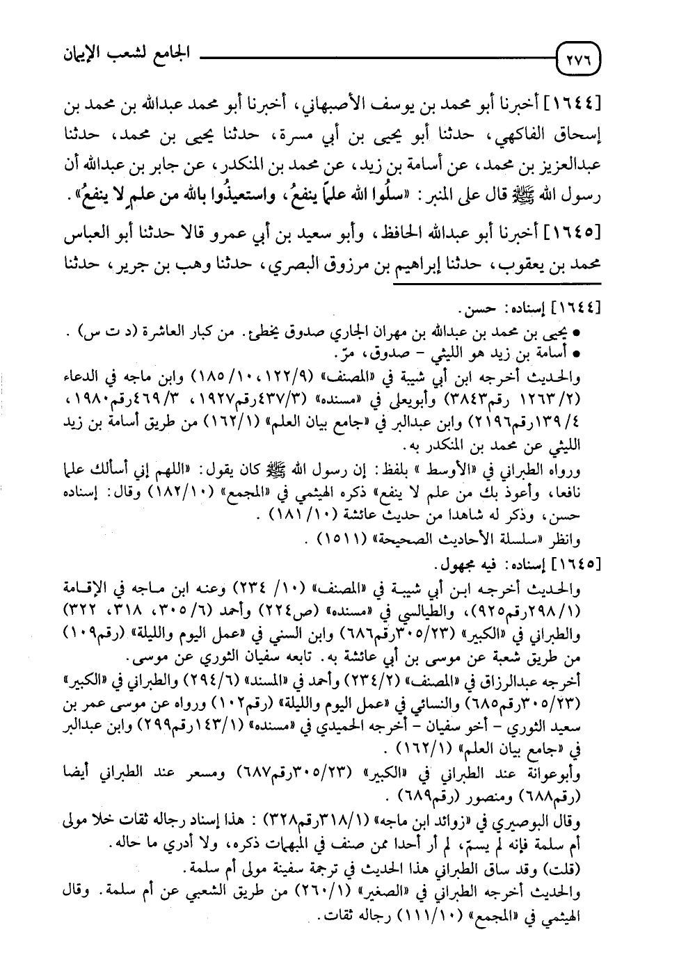 1644 - أَخْبَرَنَا أَبُو مُحَمَّدِ بْنُ يُوسُفَ الْأَصْبَهَانِيُّ، أخبرنا أَبُو مُحَمَّدٍ عَبْدُ اللهِ بْنُ مُحَمَّدِ بْنِ إِسْحَاقَ الْفَاكِهِيُّ، حدثنا أَبُو يَحْيَى بْنِ أَبِي مَسَرَّةَ، حدثنا يَحْيَى بْنُ مُحَمَّدٍ، حدثنا عَبْدُ الْعَزِيزِ بْنُ مُحَمَّدٍ، عَنْ أُسَامَةَ بْنِ زَيْدٍ، عَنْ مُحَمَّدِ بْنِ الْمُنْكَدِرِ، عَنْ جَابِرِ بْنِ عَبْدِ اللهِ، أَنَّ رَسُولَ اللهِ صَلَّى اللَّهُ عَلَيْهِ وَسَلَّمَ قَالَ عَلَى الْمِنْبَرِ: " §سَلُوا اللهَ عِلْمًا يَنْفَعُ، وَاسْتَعِيذُوا بِاللهِ مِنْ عِلْمٍ لَا يَنْفَعُ "