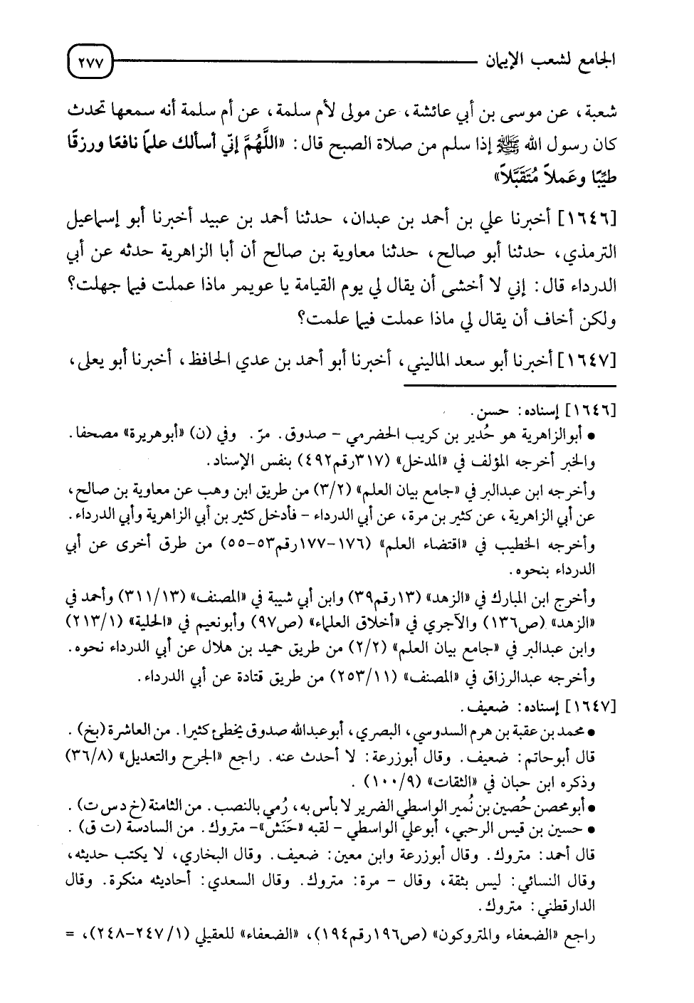1646 - أَخْبَرَنَا عَلِيُّ بْنُ أَحْمَدَ بْنِ عَبْدَانَ، حدثنا أَحْمَدُ بْنُ عُبَيْدٍ، أخبرنا أَبُو إِسْمَاعِيلَ التِّرْمِذِيُّ، حدثنا أَبُو صَالِحٍ، حدثنا مُعَاوِيَةُ بْنُ صَالِحٍ، أَنَّ أَبَا الزَّاهِرِيَّةِ حَدَّثَهُ، عَنْ أَبِي الدَّرْدَاءِ، قَالَ إِنِّي: " §لَا أَخْشَى أَنْ يُقَالَ لِي يَوْمَ الْقِيَامَةِ: يَا عُوَيْمِرُ مَاذَا عَمِلْتَ فِيمَا جَهِلْتَ؟ وَلَكِنْ أَخَافُ أَنْ يُقَالَ لِي: مَاذَا عَمِلْتَ فِيمَا عَلِمْتَ "